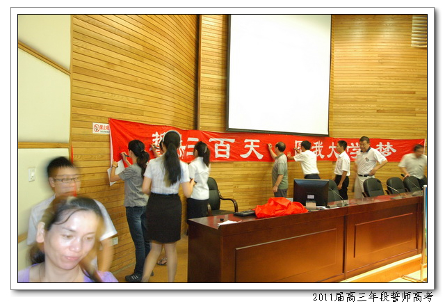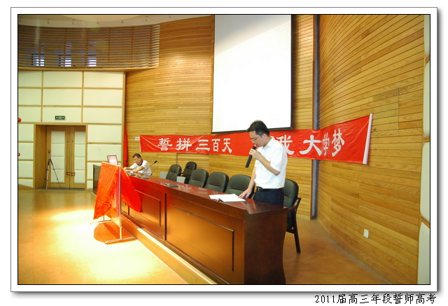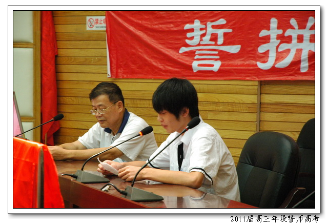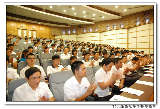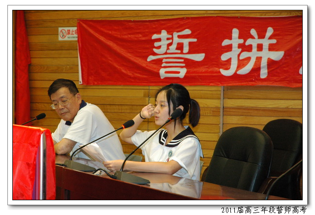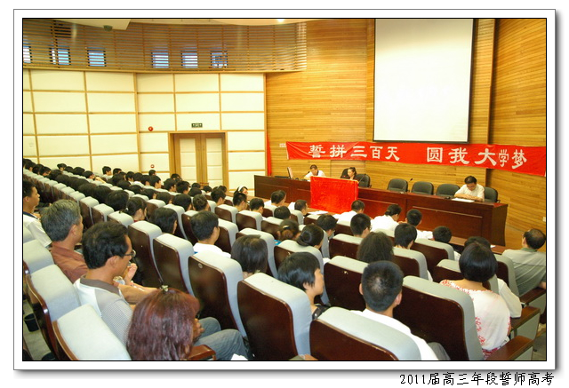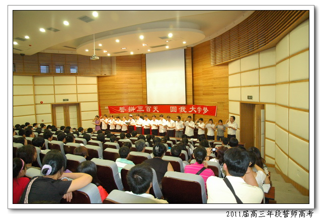 8月12日,下午4:50,会议中心二楼,2011届高三年段全体师生举行主题为“誓拼三百天,圆我大学梦”的誓师高考活动。俞继圣校长、林仰仙校长助理、及高三年段全体家长应邀到场。会上,文科学生代表曾槟同学、理科学生代表陈硕慈同学、家长代表依次发言。高三年段全体教师在全体在场的领导、家长、同学们面前庄严起誓,年段全体老师在未来的三百天里,将和全体同学一起,团结拼搏,努力奋斗,为延续学校在2009、2010年高考中创下的辉煌写下新的篇章。