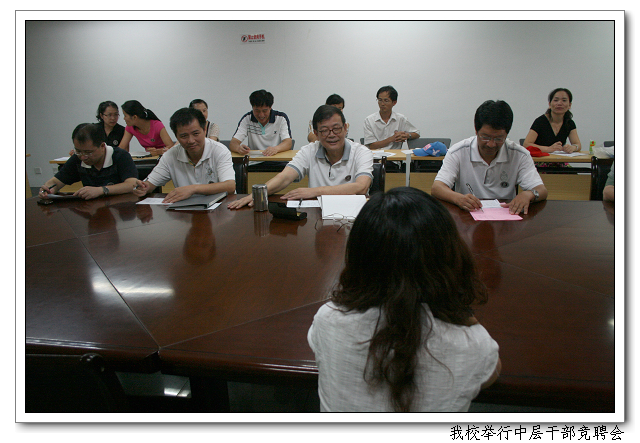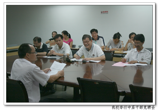 9月4日上午8:00,五楼会议室,学校中层干部竞聘会如期举行。尤江龙等六名老师报名参加了教研、后勤、校务三个处室副主任的竞聘活动。经过笔试之后,参加竞聘的六位老师分别就各自竞聘岗位发表演讲,阐述了对各口工作的设想。精彩的演讲辞赢得在场20位评委的阵阵掌声。