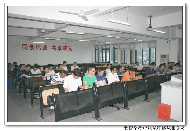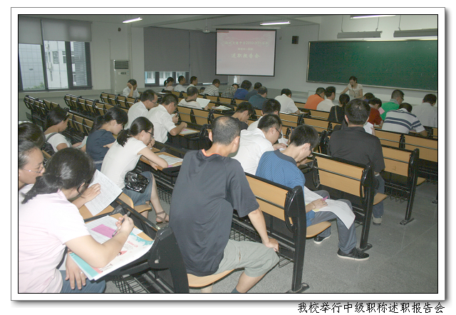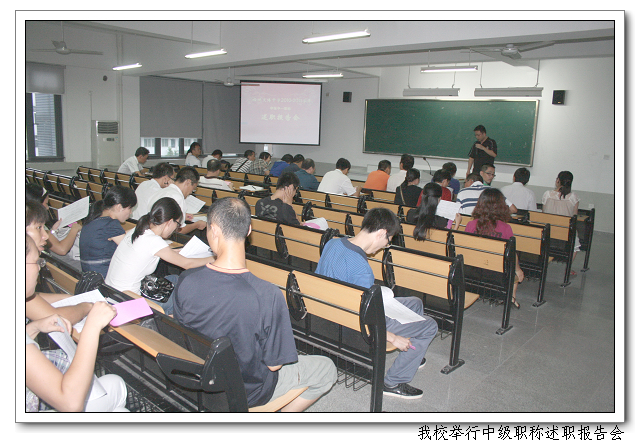 9月17日下午,4:50,大课教室(一),我校举行中级职称述职报告会。申请参评2010中级职称的柯惠君等14位老师,分别就本人任职中学二级教师以来的工作情况,面向中级职称评审推荐组及全体教研、集备组长进行述职。事务处组织现场民意测评,推荐组成员进行投票表决,确定学校推荐参评中级职称人选。