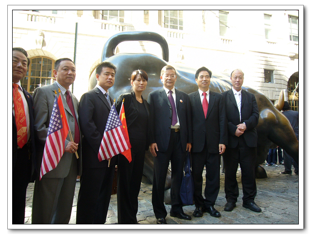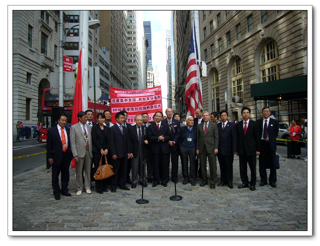图1:参加美中友好协会在纽约华尔街铜牛前举行的庆祝中华人民共和国国庆升中美两国国旗仪式。