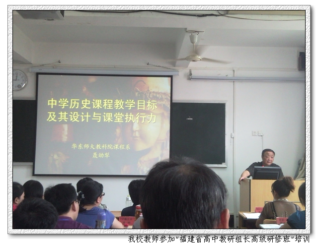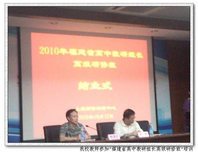2010.10.6-10.15我校语文教研组组长郑小芳和历史教研组组长黄鹤鸣参加2010年“福建省高中教研组长高级研修班”培训。培训采取“5+5”模式,即5天集中福建教育学院理论研修,5天到上海培训基地实践研修。两位教师珍惜集中研修机会,积极参与各项培训活动,广泛汲取专家、名师真知灼见和培训基地的先进理念、特色成果。此次培训为我校教师自我提高、自我成长、自我发展搭建了一个良好的平台。