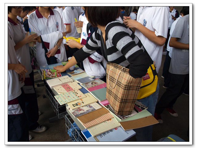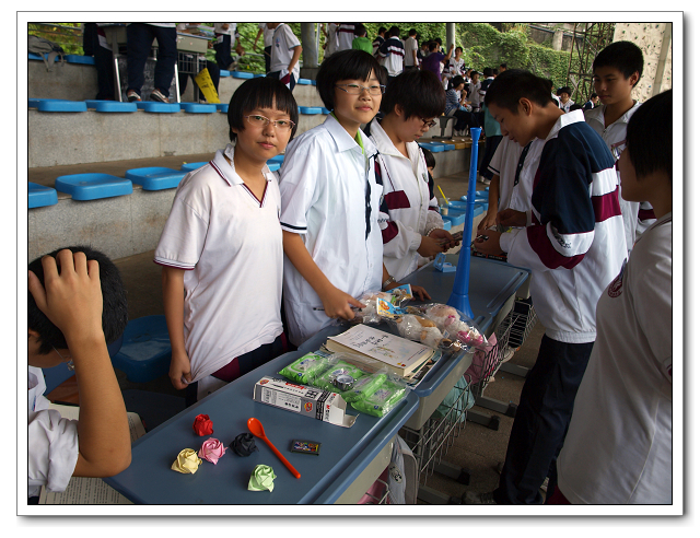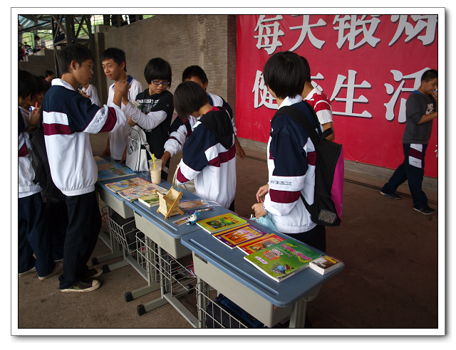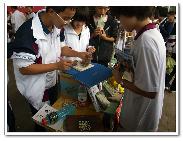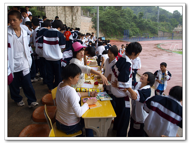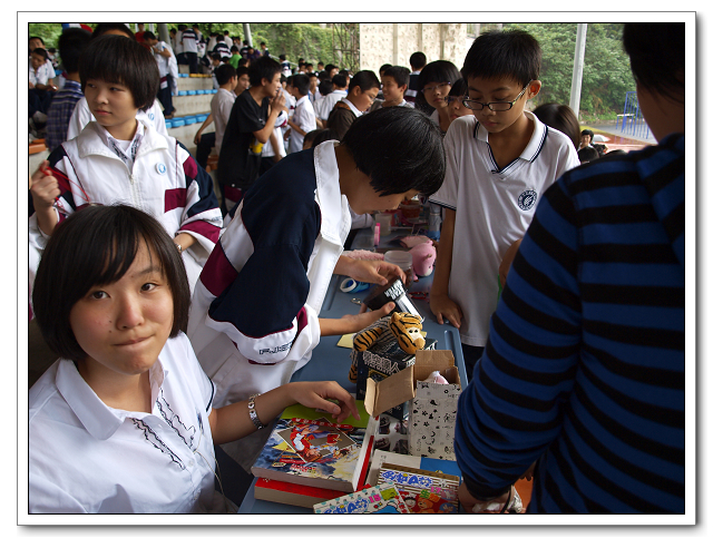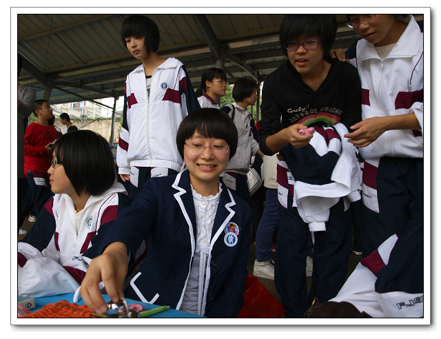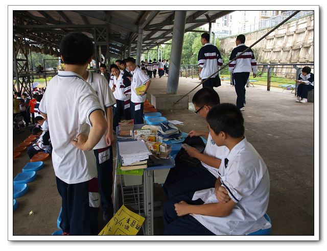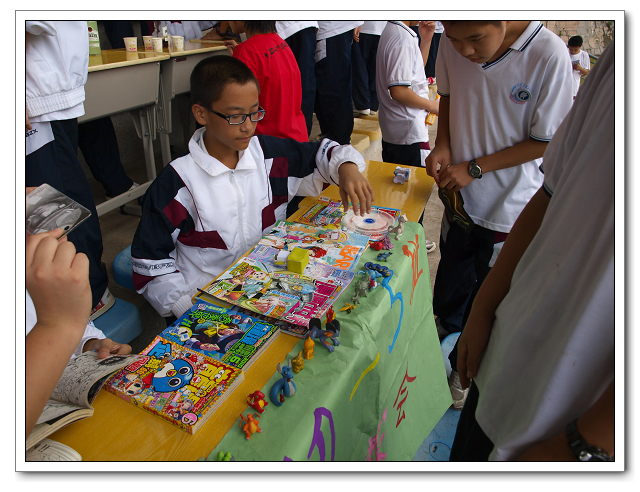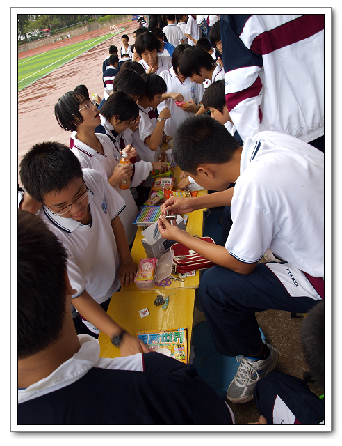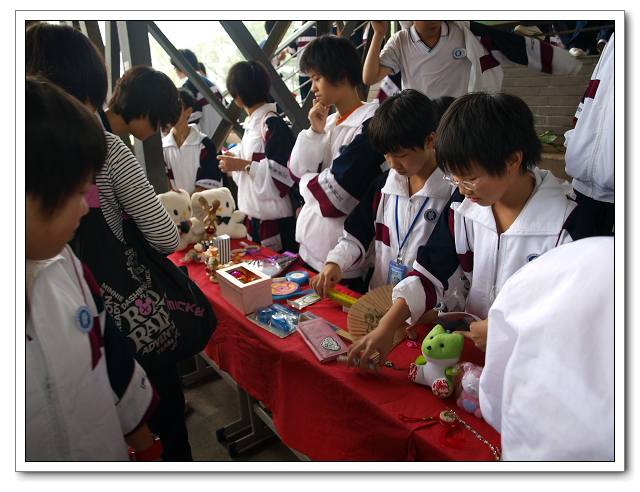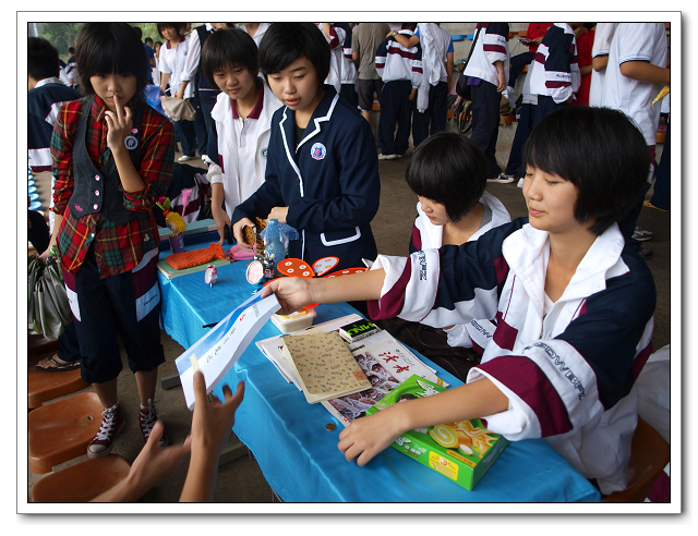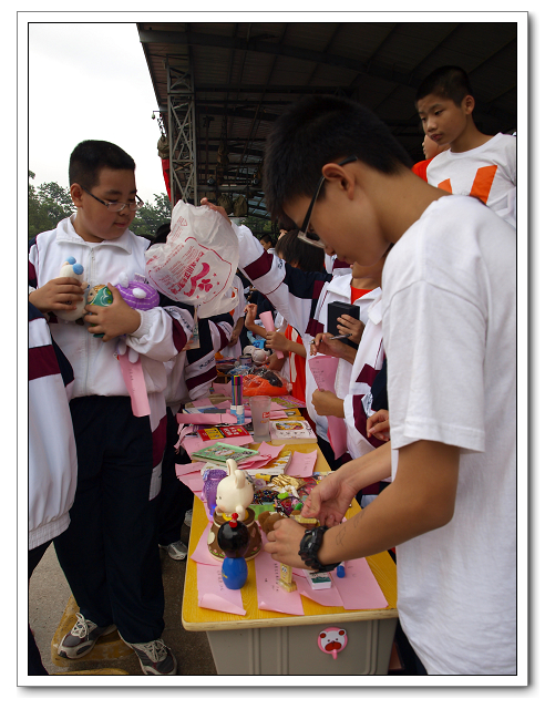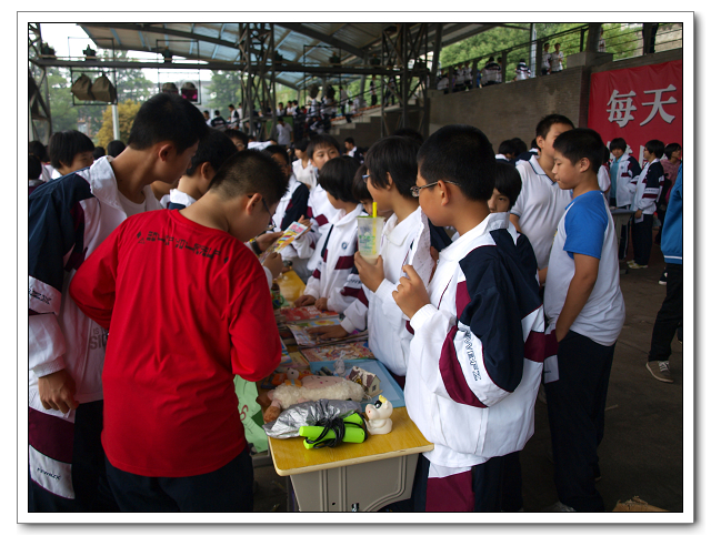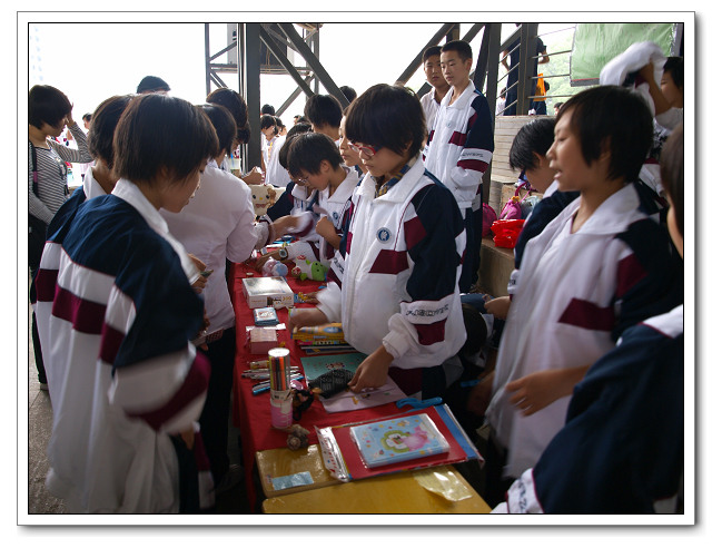 2010年10月23日下午,我校两委首次举办以“循环利用,爱心传播”为主题的跳蚤市场活动。虽然天降细雨,但现场气氛热烈,叫卖声此起彼伏,快乐无不洋溢其间。此次活动不仅让旧物得到充分利用,各班同学还自愿将活动期间的盈利进行募捐,用于向聋哑学校的学生传递我校同学们的爱心。