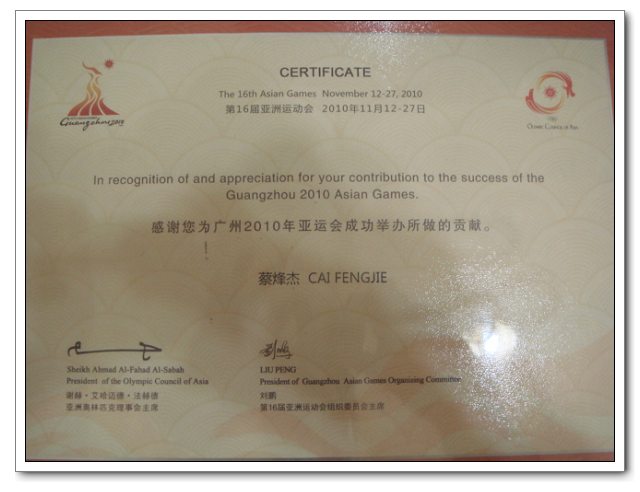 我校蔡烽杰老师圆满完成第16届广州亚运会羽毛球裁判工作,获得由亚奥理事会主席谢赫·艾哈迈德·法赫德和第16届亚运会组委会主席刘鹏共同签署的证书。于11月22日返回学校。