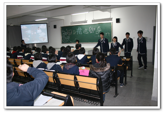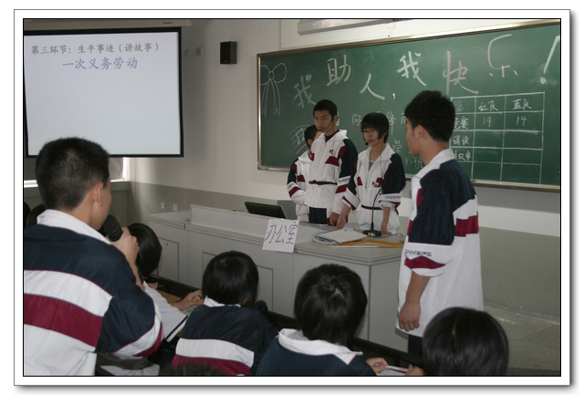读诗、赛歌、跳舞,讲故事、演小品、集体朗诵、才艺展示、师生交流……这些凝聚着集体智慧与汗水的主题班会像一场场丰盛的晚宴,着实令观摩的师生大开眼界。2011年2月28日到3月1日,我校成功举办了新学期主题班会评比活动。全体非毕业班的班主任、年段长、学校领导参加了活动;活动还吸引了不少任课老师的参与。