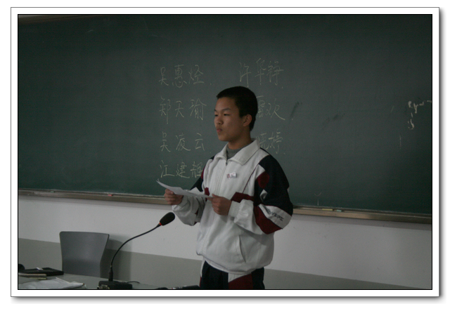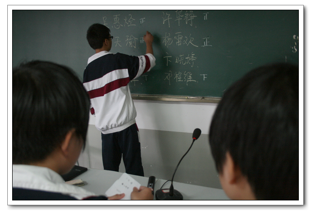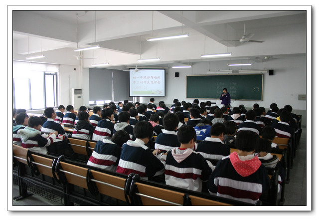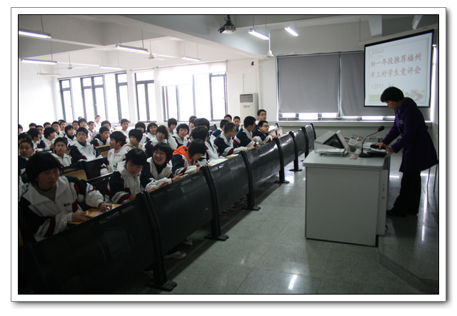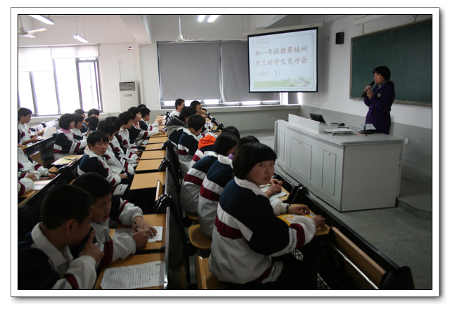 2011年3月9日中午,初一年段在年段长主持下,在大课教室一隆重召开了推荐福州市三好学生的竞评会。按照德育处所分配的两个名额,为了推选出真正优秀的品德好、学习好、成绩好的学生,年段坚决执行民主程序,遵循公开、公平、公正原则:先在周一年段早会上公布参评条件→班会课各班民主推选出1名班级最优秀侯选人→年段长组织8个同学按抽签顺序,上台陈述自己的主要事迹→由年段临时随机抽调的每班10个学生代表、任教全年段的教师进行无记名投票→年段领导小组讨论通过,最终初一(8)班郑天瑜和初一(7)班杨雷欢脱颖而出,获得参评福州市三好学生的资格。同时,结合平时各班入学以来的班级学习成绩、常规管理、各种德育活动成绩量化结果,推荐初一(5)班参评福州市先进班集体。