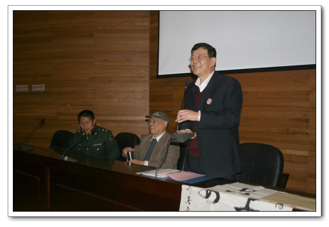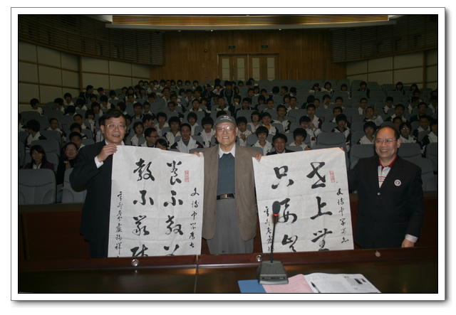 讲座结束后,卢司令员当场把自己书写的两幅字联敬送给俞校长,并同在场的师生留影纪念。林仰仙校长助理主持了这场讲座。