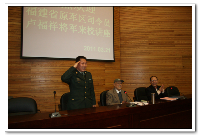 卢将军14岁参军入伍,参加新四军抗日,15岁加入中国共产党。曾参加过淮海战役、渡江战役以及解放福建等重大战斗,在战争年代中负重伤三次,立战斗三等功七次,获中华人民共和国授予《三级解放勋章》和中央军委授予《独立功勋荣誉章》。当讲到他在1947年的一次攻坚打援战斗中,头部负重伤,失去知觉,血流满面,被抬去埋葬发现没死又救活下来时,全场爆以热烈的掌声。在场的师生受到一次深刻而有意义的现身爱国主义和革命英雄主义教育,仅短短一个小时的讲座,师生们被卢将军的战斗英雄事迹深深感动,热烈的掌声与敬意之情在会议中心绕梁回响。