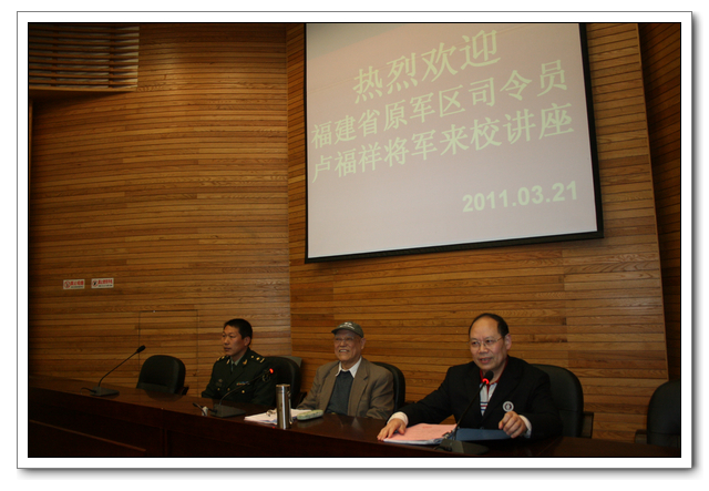 为了更好地开展“迎接建党90周年”和“纪念辛亥革命100周年”系列活动,3月21日下午,学校聘请福建省原军区司令员卢福祥将军,亲临我校讲述自己革命战争的亲身经历和身边战斗英雄事迹,进行爱国主义和革命英雄主义教育。党员教师,入党积极分子,团委、学生会干部,初一、二年各班委、少先队干部,高一、二年各班委、团支部干部等200多人到场聆听。