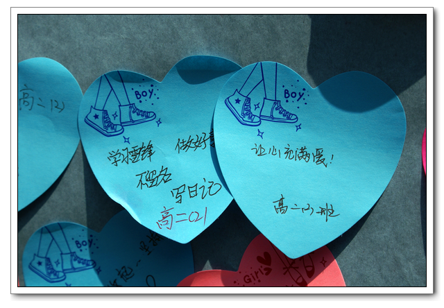 本次学生会在食堂门口设立了一面爱心墙,各班同学纷纷抒发自己对雷锋精神的感想。同学们十分热情,不一会儿有很多张爱心贴粘贴在了爱心墙上,望着那色彩缤纷的爱心贴,代表着同学们内心最最真实的感想与祝福。相信我们的校园也将处处有爱有奉献!