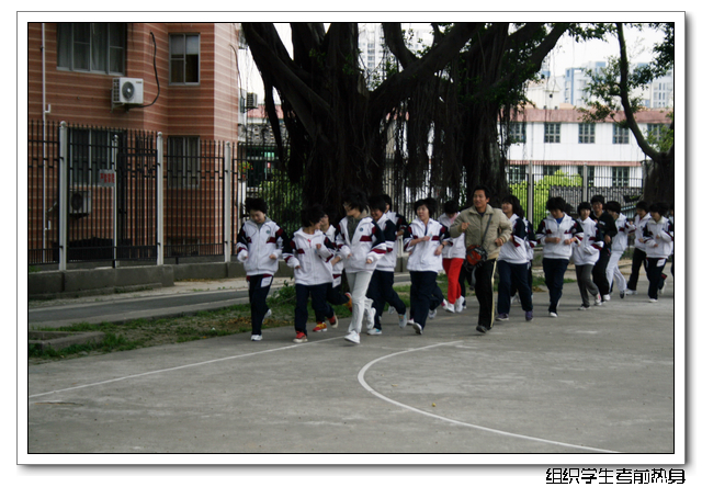 我校初三年段学生顺利完成体育中考。2011年4月12日上午,我校初三全体考生在陈衡段长的带领下,奔赴福州十四中考场,林仰仙校长助理、体育组五位教师及初三全体教师、校医一同前往。初三的同学们凭着扎实的基本功和过硬的心理素质,在考场上龙腾虎跃,奋勇拼搏,考出了好成绩,达到了学校预期的目标,为我校中考的全面胜利打下了坚实的基础。