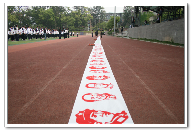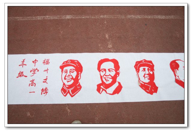 第五届校园艺术节,美术组在学校德育处的配合下,完成了班班有美展的活动,上周,我们利用课间操的时间,向全校师生展示了课堂上精心制作的剪纸样品。初一年段的《水浒人物》50米长卷、高一年段的《主席在我心中》15米长卷和高一年段的主席像剪纸将参加福州市庆祝建党90周年师生作品展。