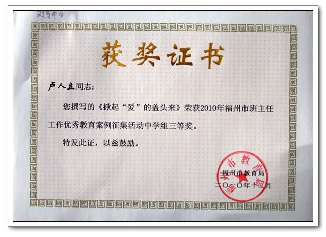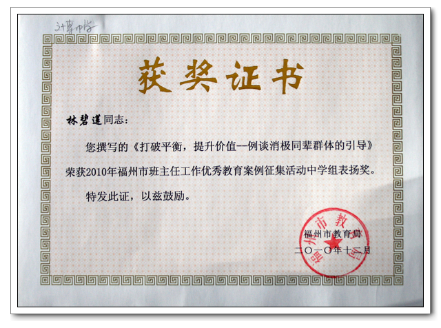 热烈祝贺我校卢人立老师撰写的《掀起“爱”的盖头来》和林碧莲老师撰写的《打破平衡,提升价值一例谈消极同辈群体的引导》分别荣获2010年福州市班主任工作优秀教育案例征集活动中学组三等奖和表扬奖。