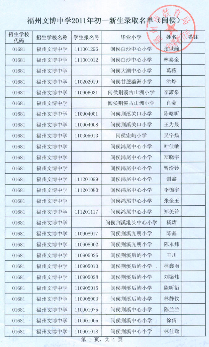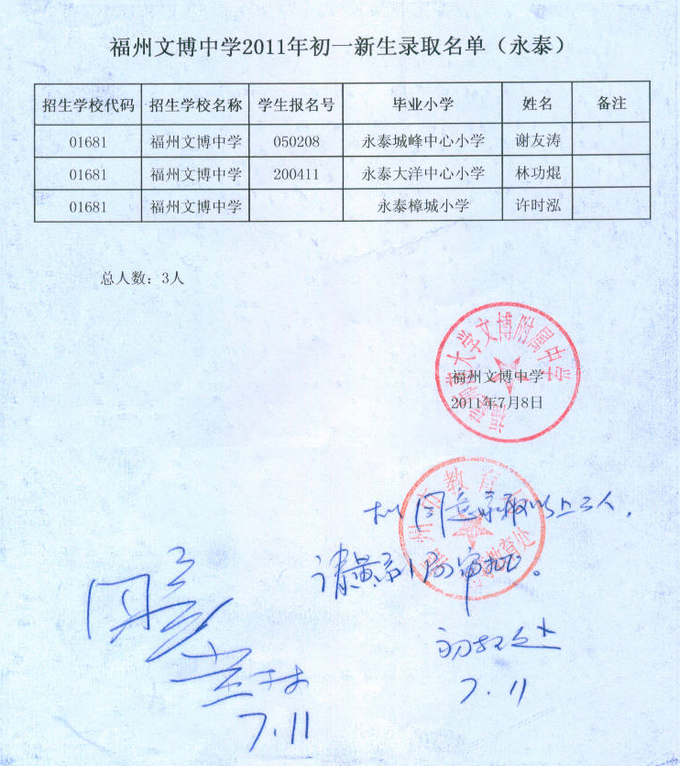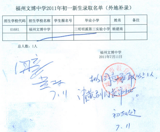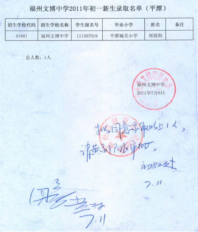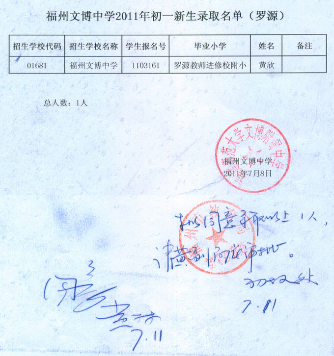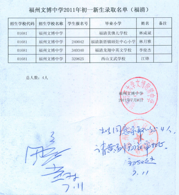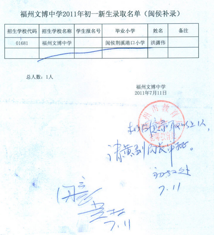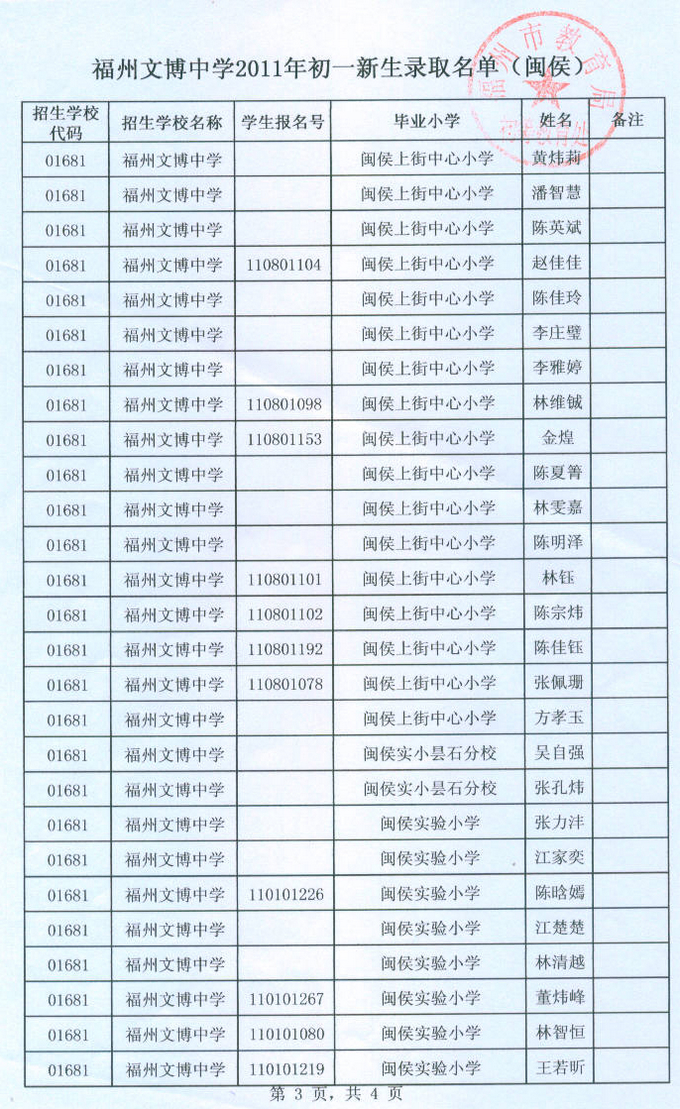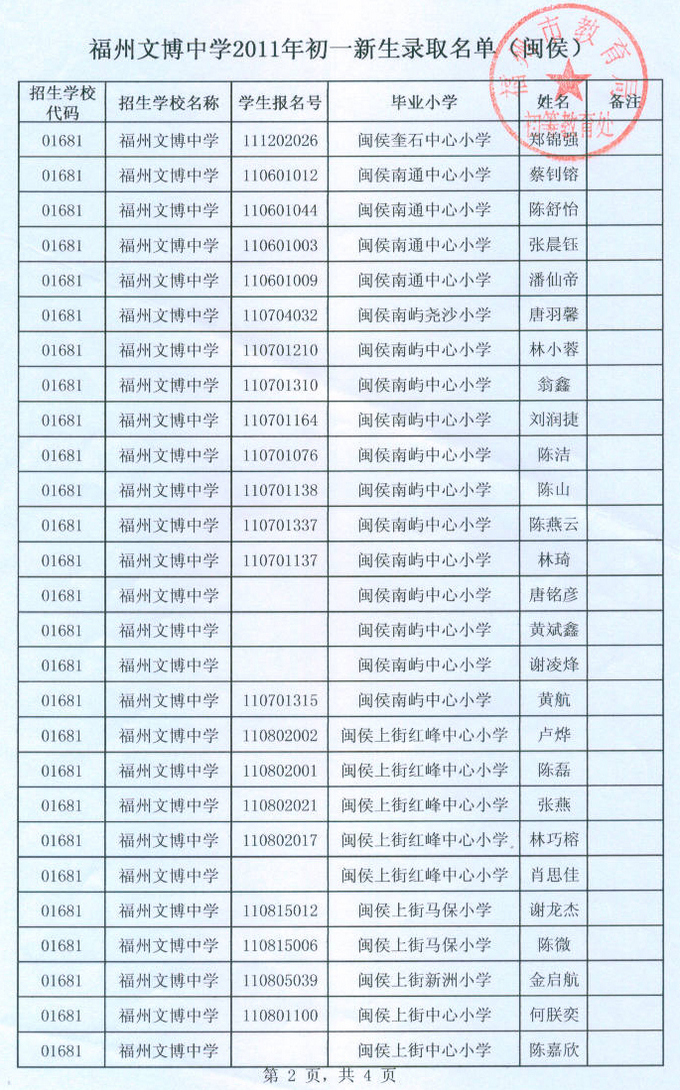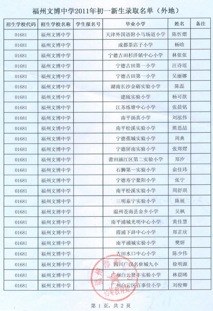 1、经福州市教育局审核批准,以下349人录取为我校2011级初一新生。