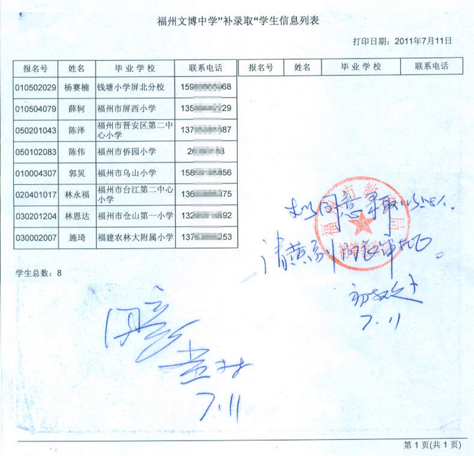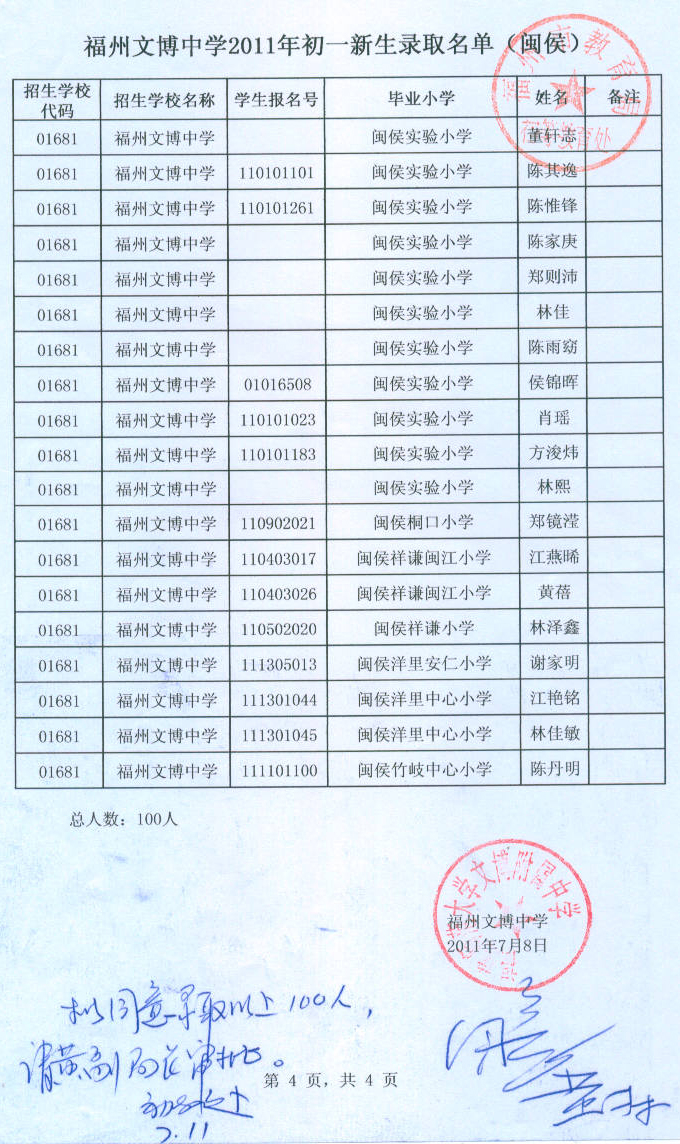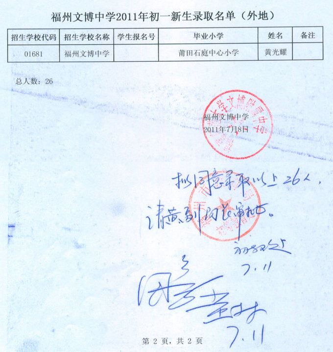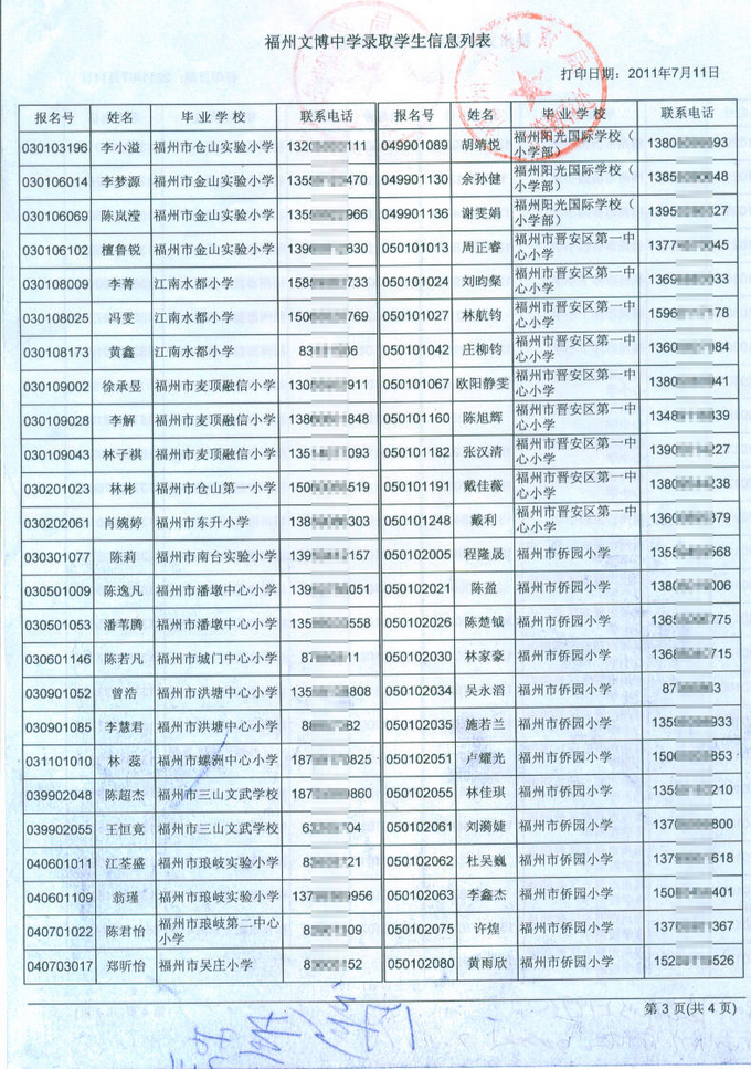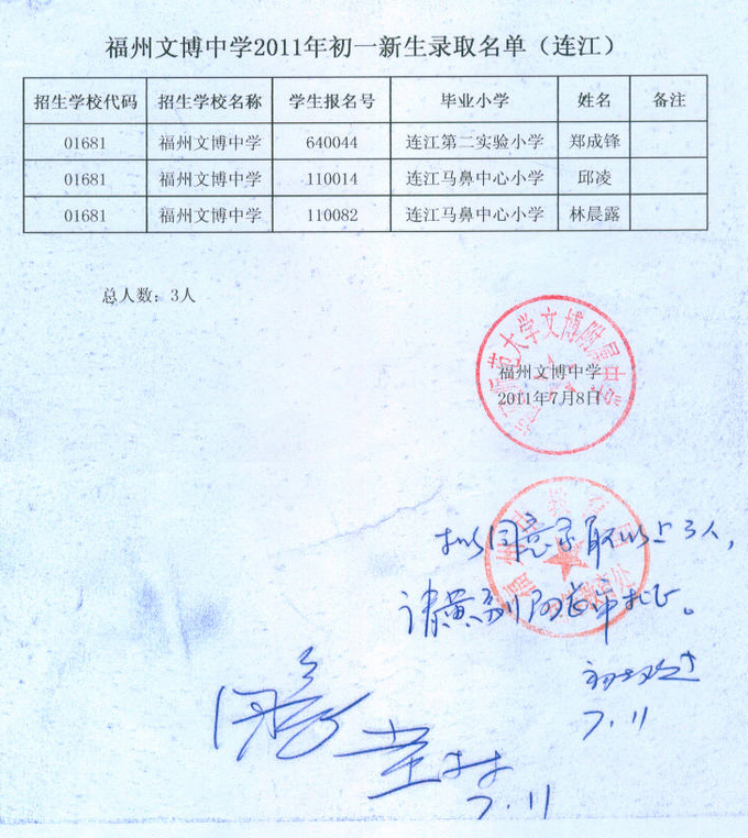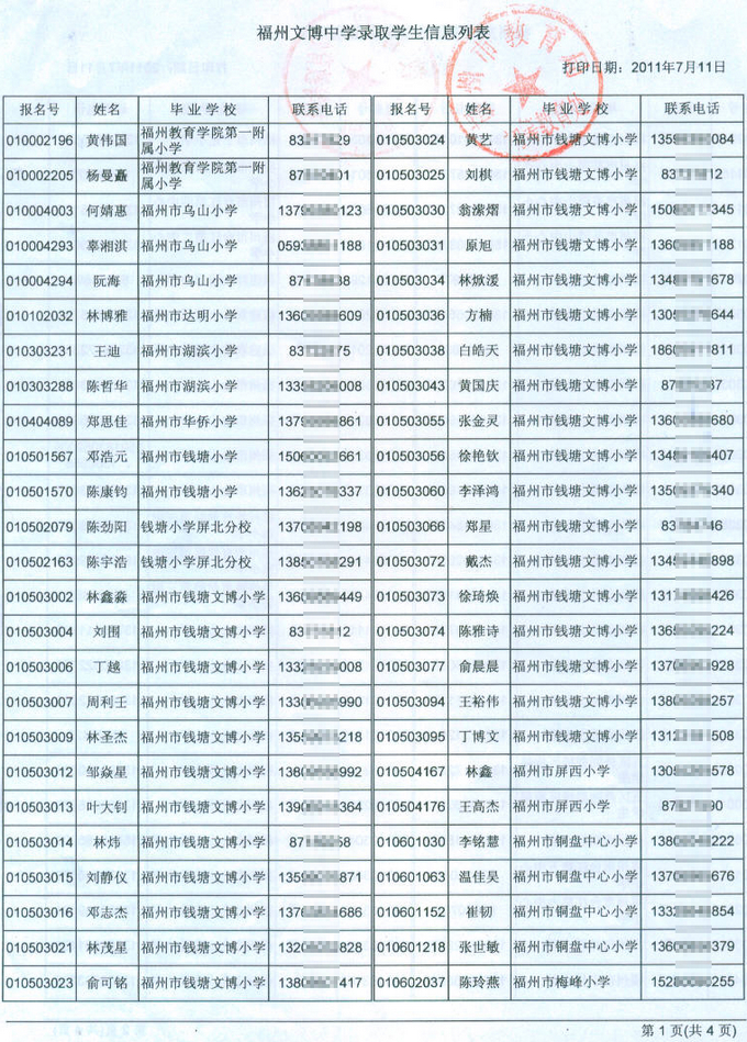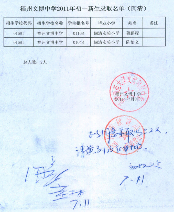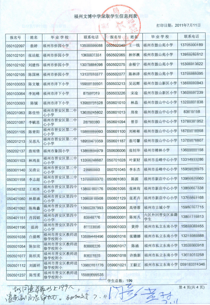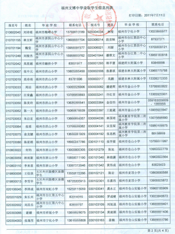 1、经福州市教育局审核批准,以下349人录取为我校2011级初一新生。