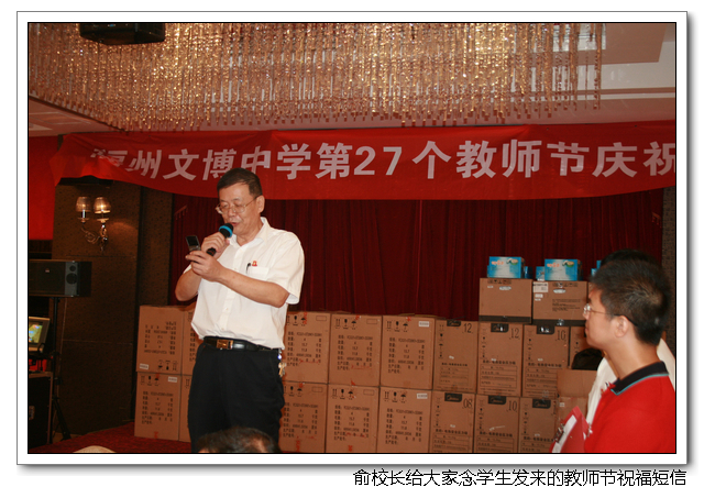 俞继圣校长首先为晚会致辞,为全体教职工转达了来自校友的短信祝福,祝贺全体教职员工节日快乐!福建金帝集团总裁助理、仁文建设有限公司总经理刘建忠先生到会祝贺,转达了集团股东会主席李德文先生、集团总裁李雄虎先生的节日问候。