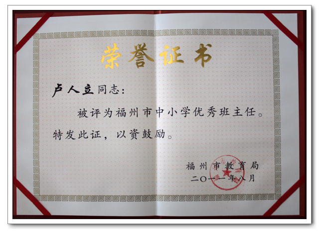 在福州市教育局开展的“2011中小学先进德育工作者、优秀班主任评选活动”中,我校林寿均老师荣获“先进德育工作者”称号。卢人立、曹友华2位老师荣获“优秀班主任”称号。