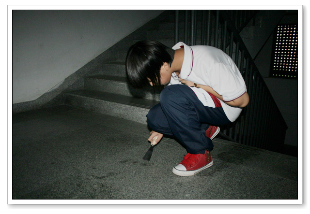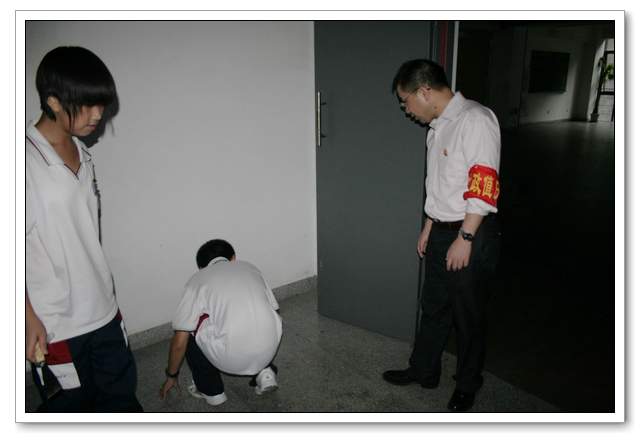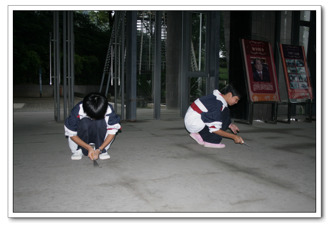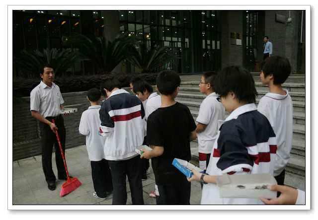 10月14日下午第三节课,初一(2)班全体同学在张锦杉、程剑书、李芸芸老师及后勤处相关人员的带领下,分为4个小组,按预定的4条线路对教学楼的楼梯、走廊、通道进行口香糖污渍的专项清洁。
