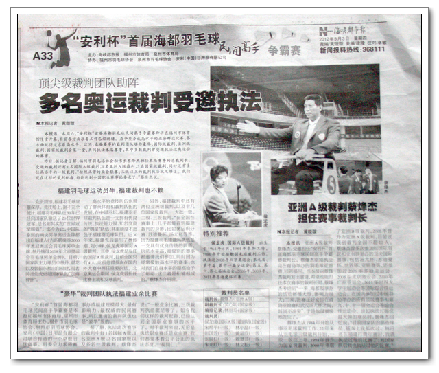 本周六,“安利杯”首届海都羽毛球民间高手争霸赛即将在福州市体育馆隆重开幕,我校蔡峰杰老师受邀担任本届比赛裁判长工作,张锦杉、赖慧芸、朱光虹、林文松老师受邀担任裁判工作。