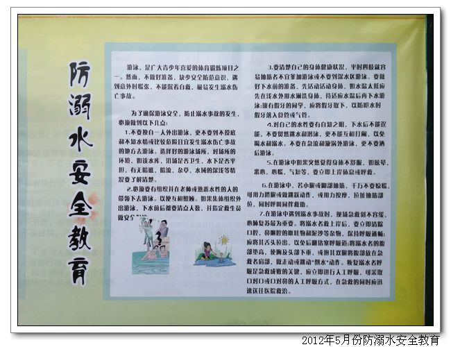 学生是祖国的明天,民族的希望。提高学生的综合素质,特别是学生的学习能力、生活能力、生存能力,都是开展素质教育的重要课题。如今的社会里,车祸、食物中毒、溺水……剥夺了许多宝贵的生命,尤其是溺水最为严重了。学生了解溺水和如何防止溺水显得非常重要。所以我校德育处在五月份举行了一系列防溺水安全教育,其中有LED播放防溺水安全警示标语、学生代表高二(5)班许倩同学对全体学生做出防溺水倡议、学校宣传栏展出防溺水知识安全教育。