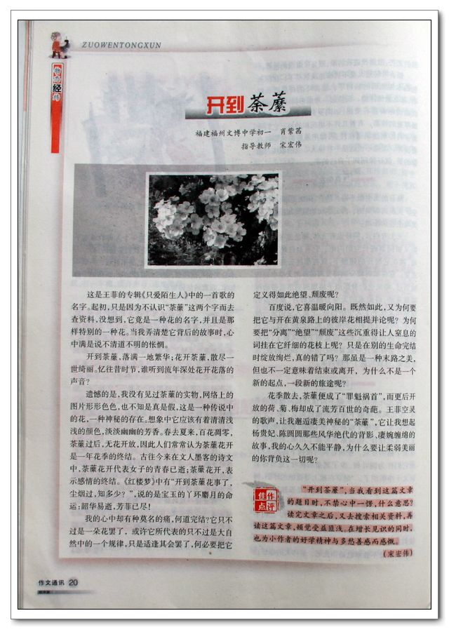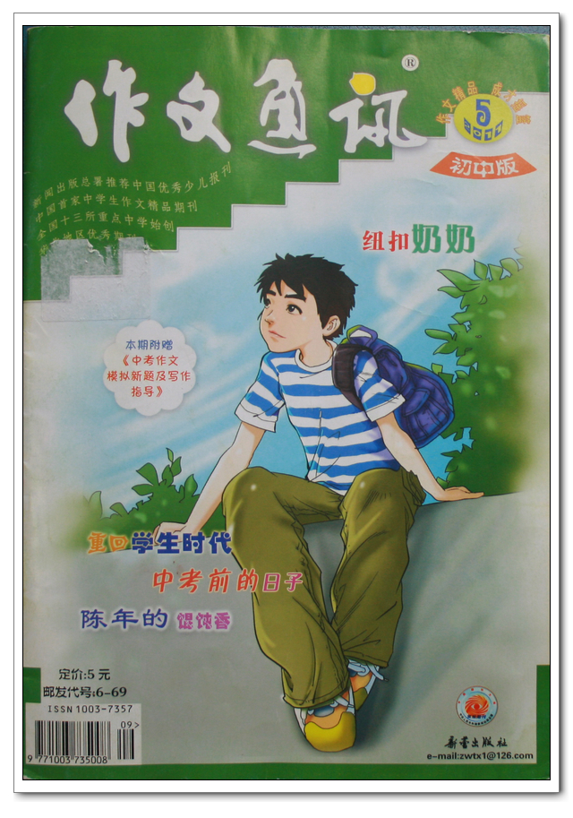 初二(3)班肖紫茜同学作文在《作文通讯》2011年第五期上发表,指导老师宋宏伟。《作文通讯》是“中国首家中学生作文精品期刊”,是由“北大附中”“北京人大附中”“上海华东师大一附初中”“福州一中”等全国十三所重点中学始创的权威作文杂志。