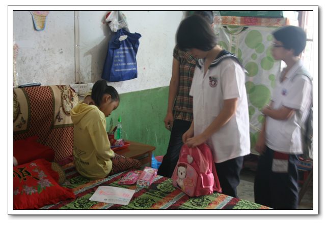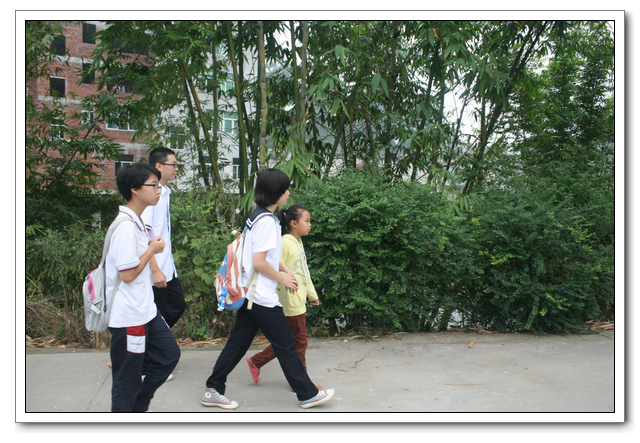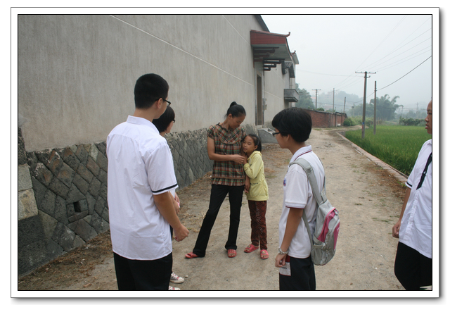 小焮一路上都不怎么和我们聊天,似乎很怕生,对她的问话也是回答得很简短。走了大概10分钟的路程,就到了昙溪中心小学的门口,小学里只有简陋的仅三层高的小楼,地面上坑坑洼洼的泥里面还掺着雨水留下的痕迹,一不小心就会踩到一脚的黄泥。在小焮的带领下,我们来到她的班级的门口,看到教室里面凹凸不平的课桌椅,想到小黄焮每天就要在这样的环境下学习,心里头便忍不住的心疼。我们在小学的门口和小焮合了影,心酸之余也向他承诺以后有机会还会去看她的!换一种方式去感受别人和我们不一样的生活,不再只是单纯在网络上、报纸上了解他们,切身实际地体会到他们艰苦生活的感受,能够给我这次机会帮助他们,献出我的一份爱心。我们应当多开展各种活动,多去帮助这些生活困难的人们,虽然不能直接给他们一些什么,但可以尽我们的微薄之力,让她们感受到有很多像我们这样的人在关注着他们。