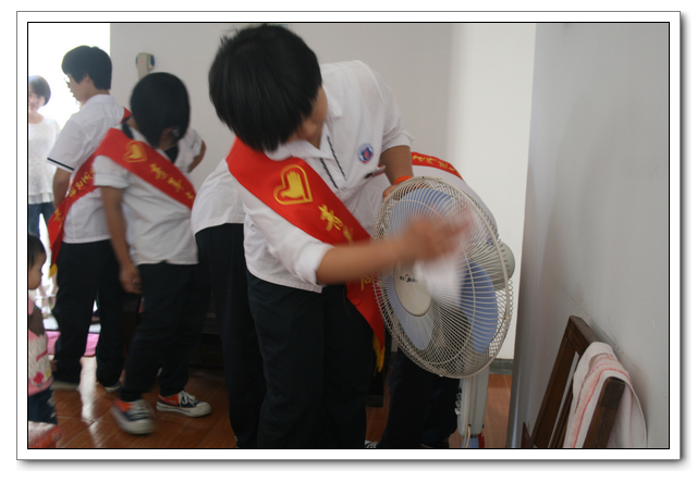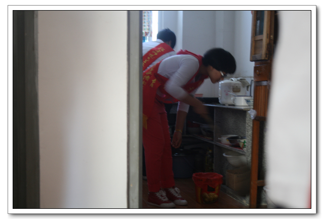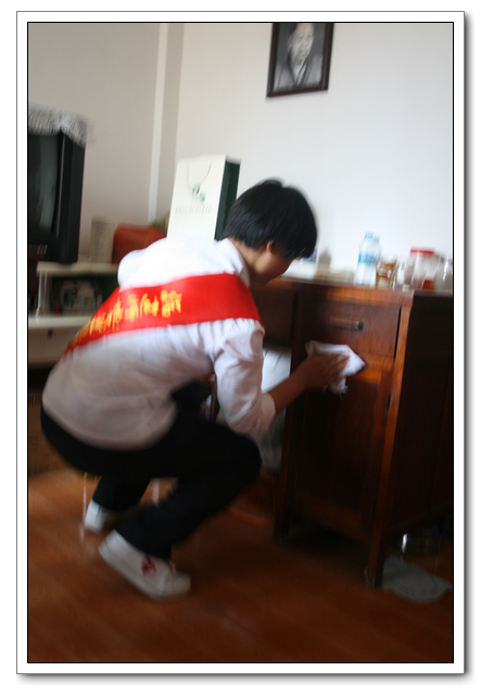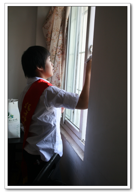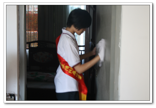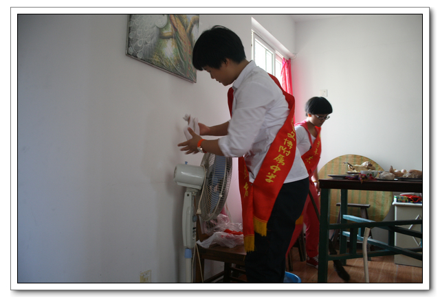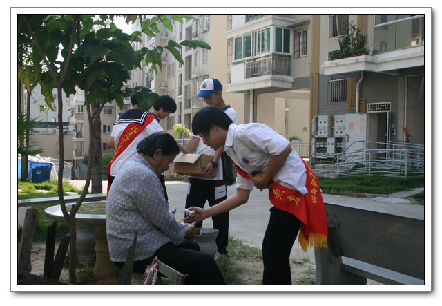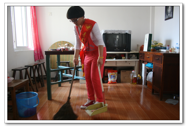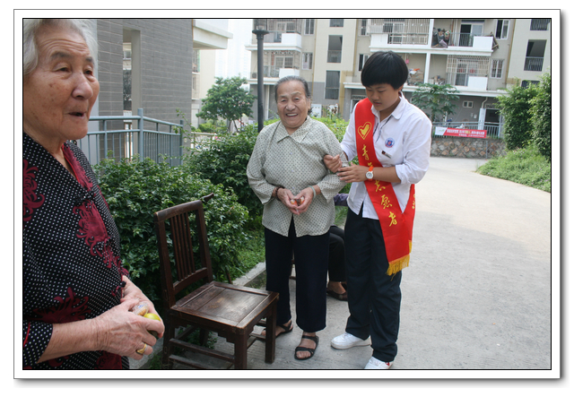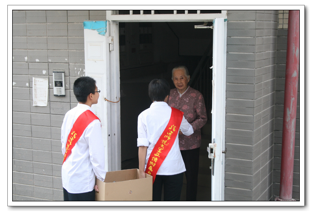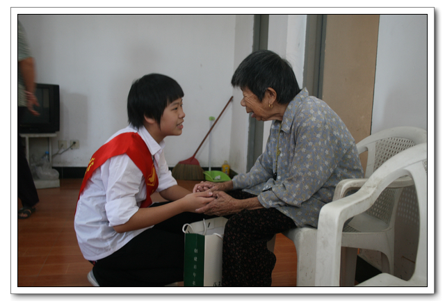 10点的时候,我们分完了月饼,分成两组,到孤寡老人家中,为他们送去我们的祝福。我所去的是一位看起来年纪有七八十岁的老奶奶家,这位老奶奶背驼得厉害,看上去黑瘦黑瘦的,一副弱不禁风的样子。听说我们要来,老奶奶颤颤巍巍地下楼来迎接我们。看着她艰难上楼的背影,我真有上去扶她一把的欲望。老人家不大,约六七十平方米的两室一厅。因为是政府的安置房,也挺整洁。只是家具极少,客厅只有两把椅子、一张小桌、一台老电视,卧室也只有一张床和一个衣柜,很有点家徒四壁的味道。校青年志愿者协会会长何扬代表我们向老人送上中秋月饼和祝福,随后我们就热火朝天地做起了卫生。奶奶坐在椅子上看着,不时来关照关照我们,用福州话夹杂着普通话交代一些诸如抹布在什么地方之类的事。我一边擦着玻璃门一边笑嘻嘻地冲她扬了扬学校自备的抹布算是回答。我在擦卧室门框的时候,坐在我旁边的奶奶突然对我说什么,我凑上去听,她用福州话加普通话加比划,大意是说让我给她儿子打电话叫他回来。我一时愣在那里不知该怎么回答。林叔飚主任见状赶紧上来解围。