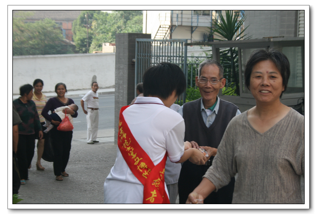 早上8:30,我们从学校出发,到达了国光社区的大儒世家四期小区。一到那里,我们就在楼底食杂店摆起了摊位,摆出我们带来的几大箱的月饼和桔子。随后我们兵分三路,几名同学留在摊点向过往居民分发橘子和月饼,另外两组同学一组拎一大纸箱橘子月饼,在小区打起了“游击战”,碰到老人小孩,就上前发月饼,并祝他们中秋节快乐。分到月饼的爷爷奶奶们都开心地感谢我们,小宝宝们也会在父母们的引导下伊伊呀呀地向我们说谢谢。这让我们很有一种满足感。