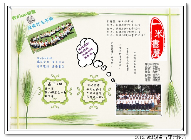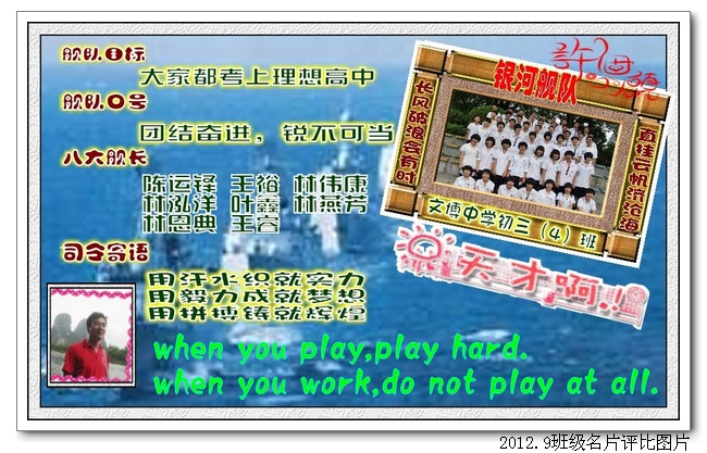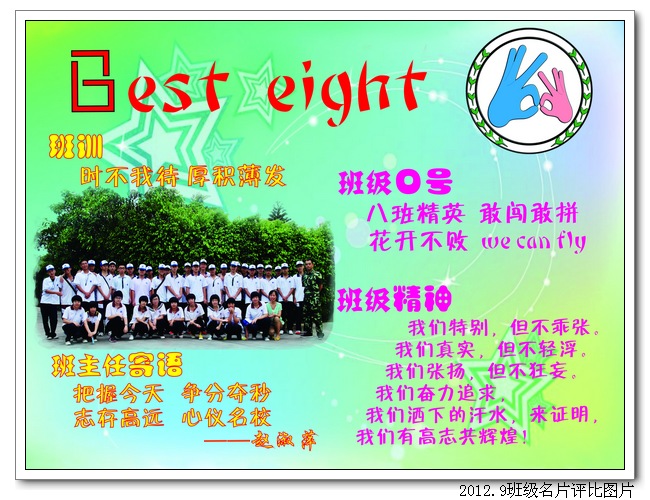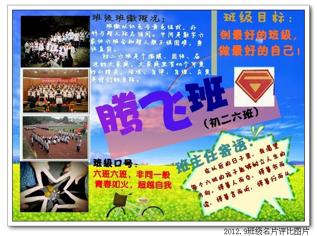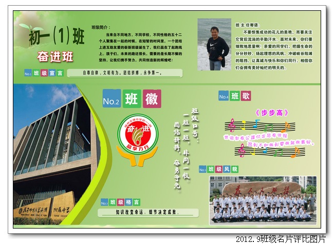 3、班级名片设计。新学年根据《福建省中小学校园文化建设评估暂行标准(试行)的通知》精神,我校组织开展了“班级名片设计评比活动”。活动得到了广大师生的积极响应,大家集思广益,制作出一幅幅精美的、有丰富内涵的作品。