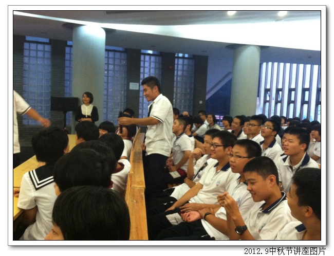 9月26日下午第四节,我校道德讲堂宣讲员余作翌老师为高一年段全体学生举行了一场题为“千里共婵娟”中秋节讲座。此次讲座余老师精心准备,PPT构思新颖,内容精彩。会上,余老师细致讲解了中秋节的来历和有关中秋节的民俗文化等。“嫦娥奔月”、“吴刚伐桂”等一个个动听的传说,让同学们再次感受到了中国传统文化的博大精深。此次活动还安排了互动环节——有奖竟答,同学们争相举手作答,把气氛推向了高潮。
