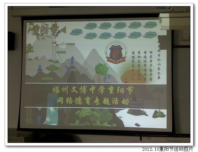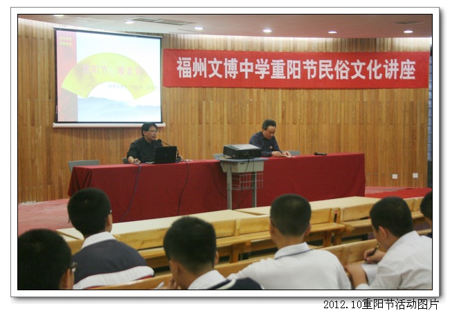 三、民俗文化讲座 10月31日,福州文博中学“道德讲堂”宣讲团成员张建玲老师给初二年段学生上了一场精彩的讲座,会上,张老师着重介绍了重阳节的由来及文化习俗。通过名师赏析、师生互动形式,让同学们深入理解重阳节便是敬老节,真切感受到尊老、敬老、助老的传统美德。