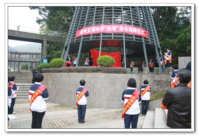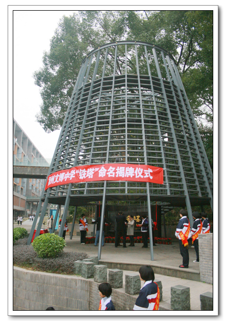 东君楼前铁塔,自2006年秋建成以来,一直未得其名。2012年10月下旬,学校开展“铁塔”多元解读和命名的文化活动。师生踊跃投稿300余篇,经过初选、复选、公投,得票最多为“未名塔”(历史组潘丽芬老师命名解读),其次“宁朴塔”(语文组郑小芳老师命名解读),第三名“文星塔”(高一8班许崇禧同学命名解读)。自此,该塔得名“未名塔”。学校董事长李德文先生为“未名塔”题写塔名。