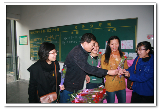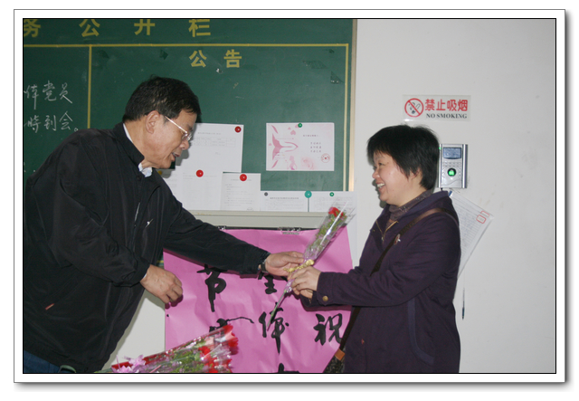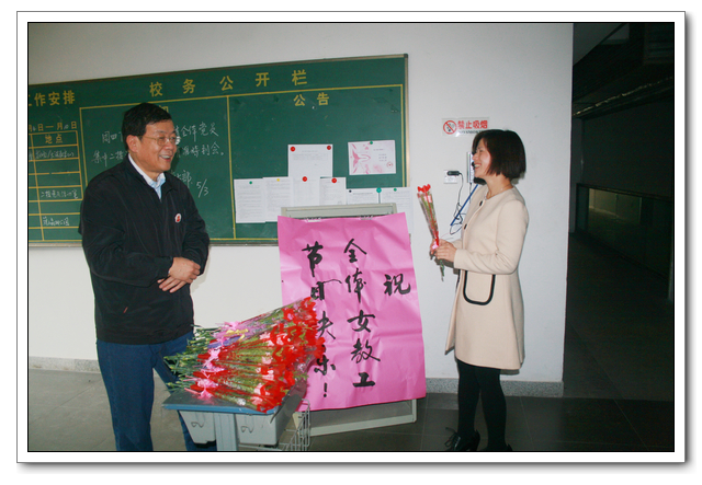 春无主!杜鹃啼处,泪染胭脂雨。又是一年春暖花开时,迎来了2013年“3·8国际妇女节”,早晨6∶50校领导俞继圣校长、校工会周啸翔主席,站立在学校办公楼的教工打卡处,给女教职工们献上一朵包装精美的康乃馨,祝愿全校135位女教职工节日快乐!清新的花香交织着女教工们喜悦的心情,温馨幸福之感挂满教工的脸庞……