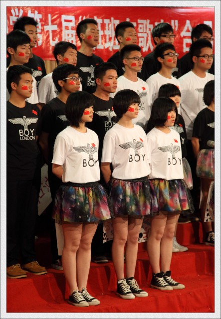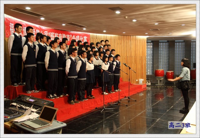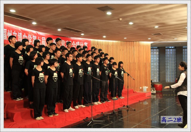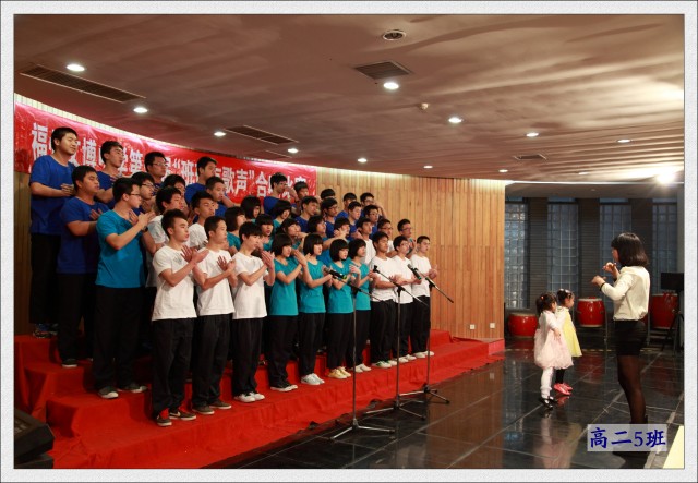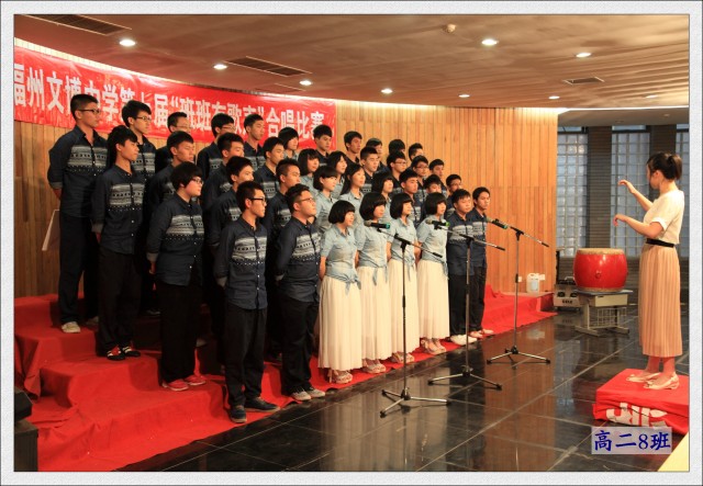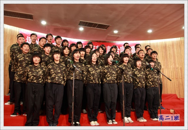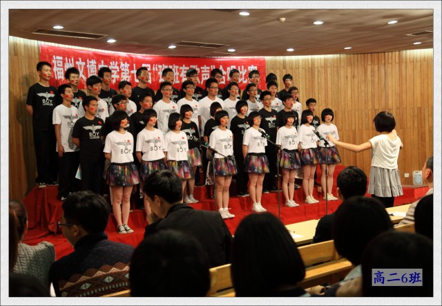 首先登上上舞台的是7班,略带紧张的他们用高亢嘹亮的嗓音唱响了军旅之歌——本次比赛必唱曲目《中国军魂》,拉开了比赛的序幕,随后他们声情并茂地演译了改编的《北京东路的日子》,带领我们徜徉在充满爱的校园里,一句“惠兰,我爱你!”,引爆雷鸣的掌声。接下来登场的是8班,男生蓝色长袖衬衫与女生飘逸的长裙搭配相得益彰,气场十足,一首《我的舞台》热情洋溢,“我的舞台我自己建造,要让全世界看到……我的未来我自己照耀,每个明天把我拥抱”,唱出了高二少男少女们对梦想的执着。第三个登场的是4班,零点乐队的经典曲目《超越》震撼人心,激情的演唱与如雷的鼓声诠释着他们的激情:“超越自己,超越赛场我们是不可战胜的力量。”接下来,穿着小清新雪纺裙与素雅毛背心的文科3班登场了,他们带来了一曲深情的歌——《父亲》,“我愿用我一切,换你岁月长留”,唱出了对父母深深的感恩与浓浓的爱。第五位登场的是美丽“冻”人的6班,朝气蓬勃,精神饱满,他们用最美的歌为梦想加油,他们坚信《梦想天空分外蓝》!接下来,2班为我们演唱了《蝴蝶飞呀》,他们“把爱画在岁月的脸上就像那蝴蝶的翅膀,迎着风声越大歌声越高亢”,班主任廖敏洁老师与陈章瑜同学带来了电子琴与吉他的伴奏,师生共谱了一曲最美的歌。接下来,身穿迷彩装的1班同学的雄纠纠气昂昂地向我们走来了,坚定的脚步与招展的团旗体现了当代青年学生坚定的信念,他们在潇洒自如的指挥林泽楠同学的带领下,为我们献上了动听的歌——《站起来》,告诉我们奔跑才有了期待,起点写着我的未来”,进取级的学子,超越自己,加油吧!最后压轴的是身着三色服装的5班,他们用清新纯净的声音演绎了《梦的怒放》,两位小天使的可爱登场顿时点燃了全场的热情,如潮的掌声,送给5班,也送给全年段师生们自己,我们都拥有一双梦的翅膀,我们“拥有冲破云霄的力量,期待着最后的怒放”!
