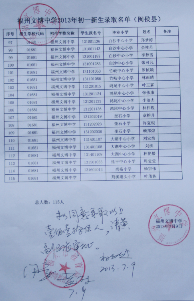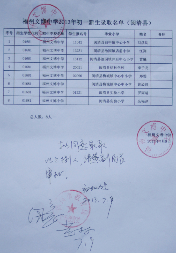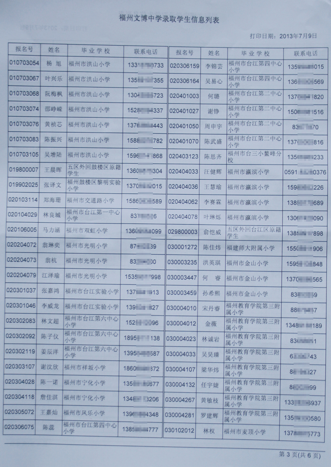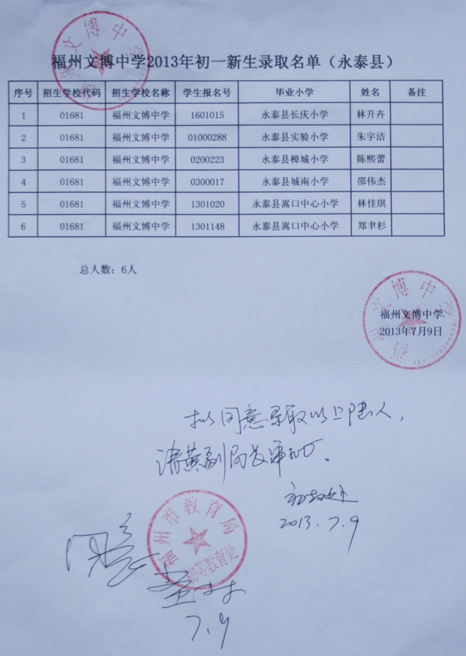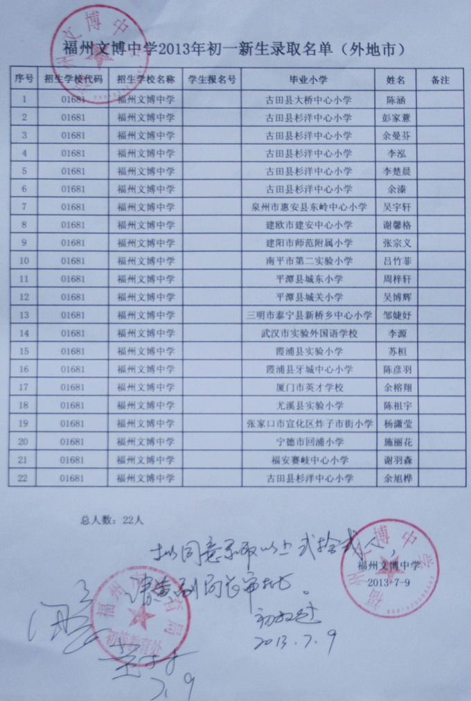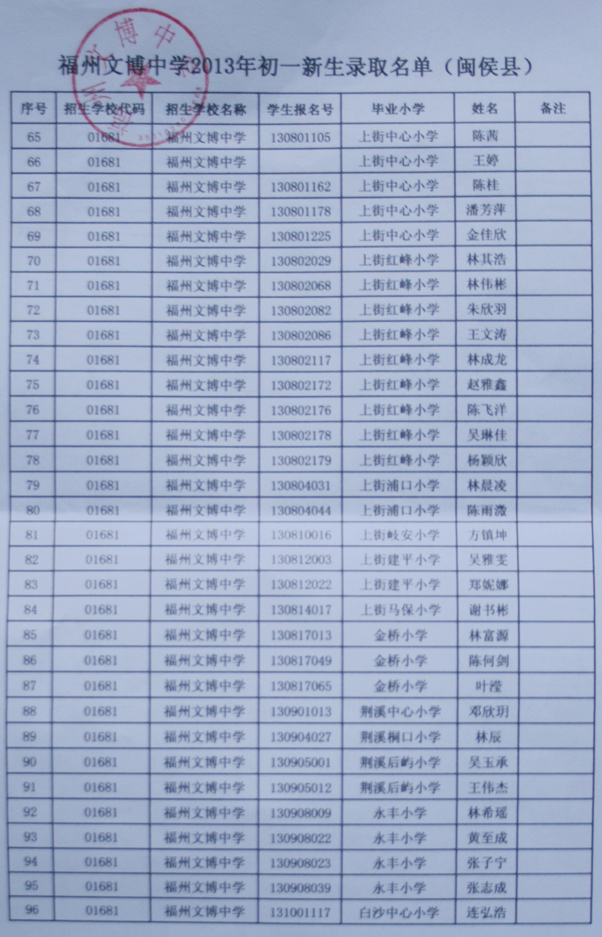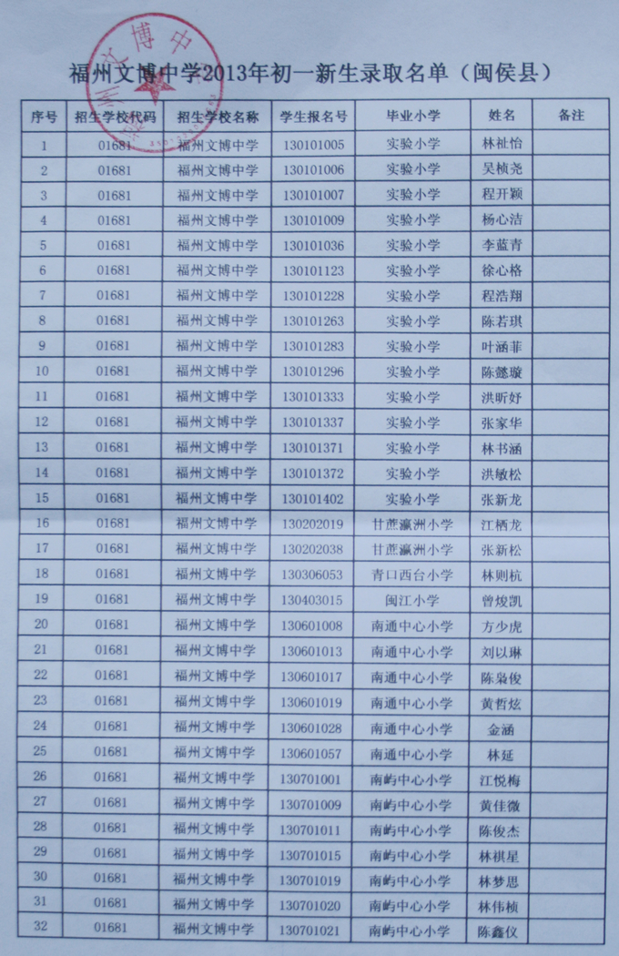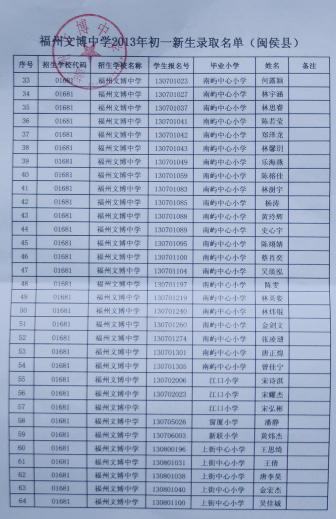 经福州市教育局批准,我校2013级秋季初一新生名单如下(发榜在学校大门口)。