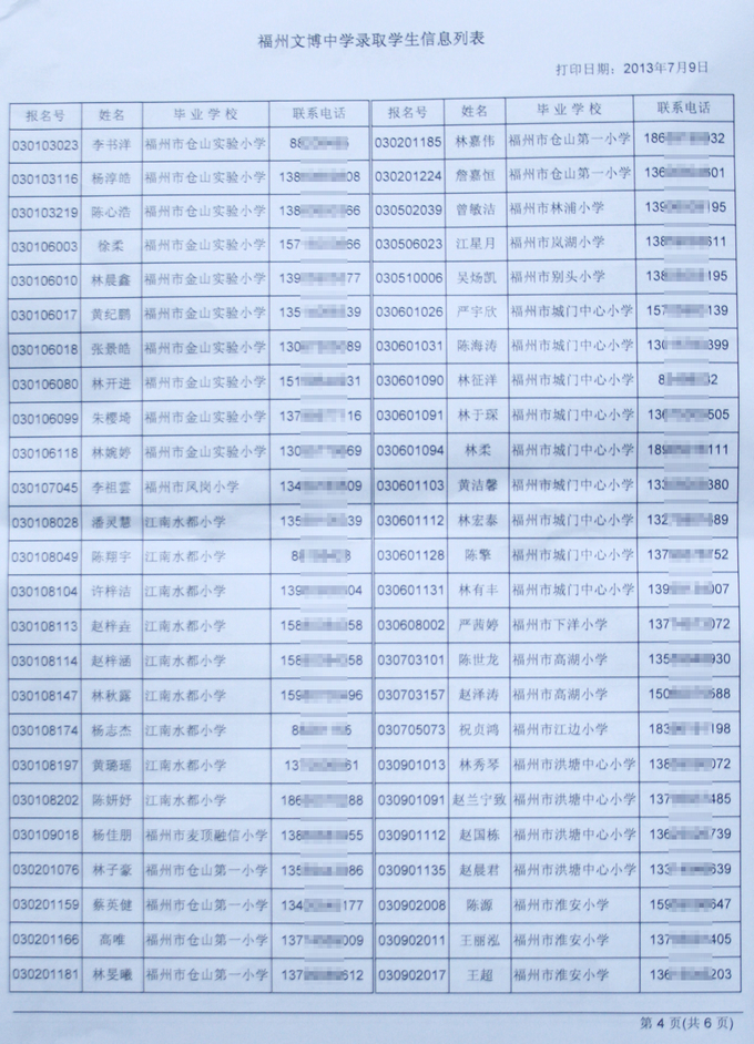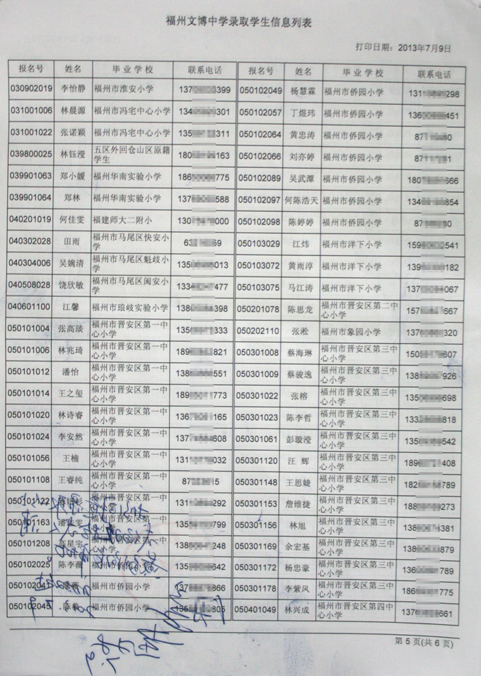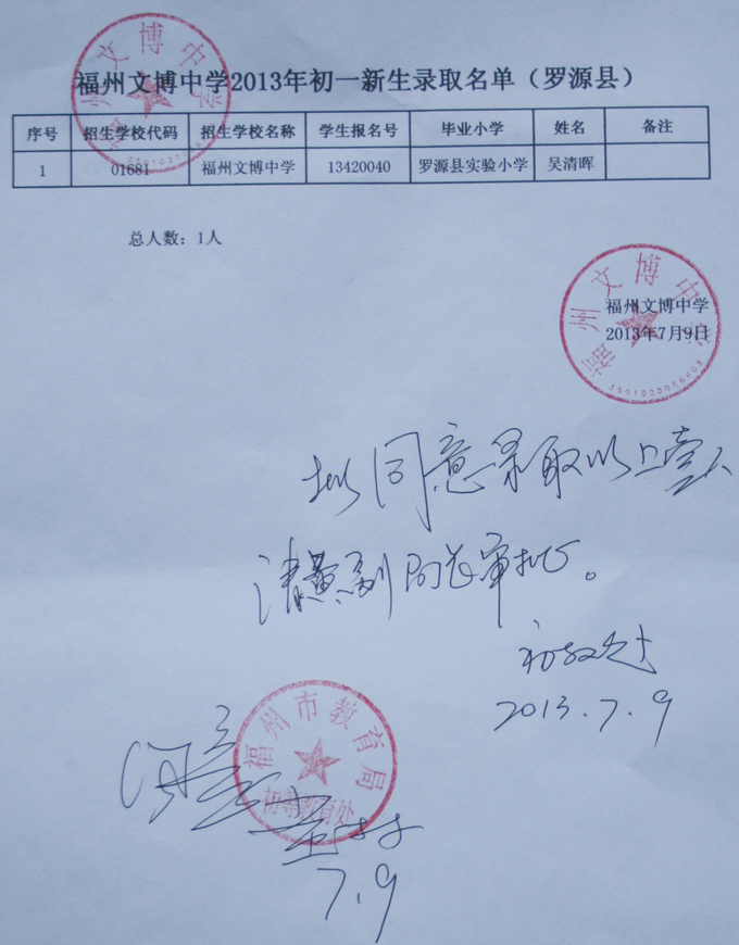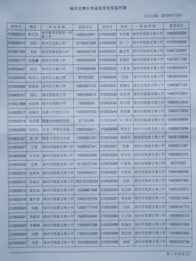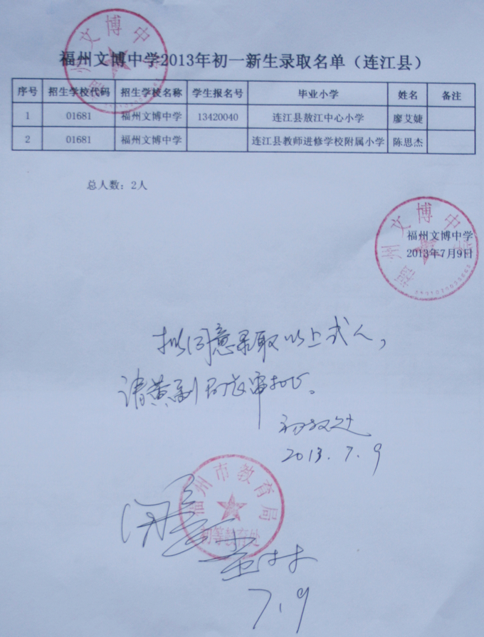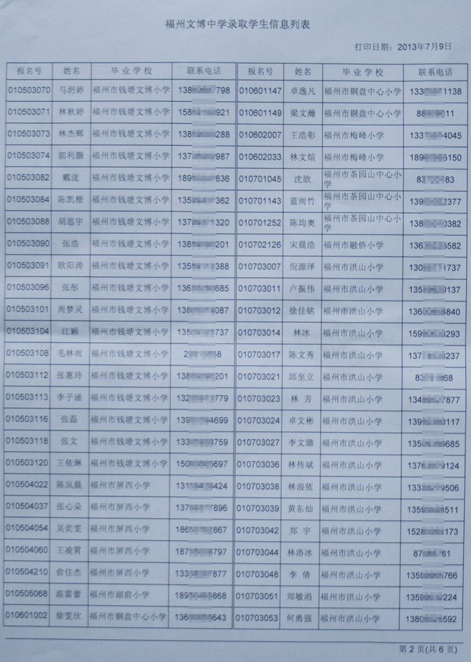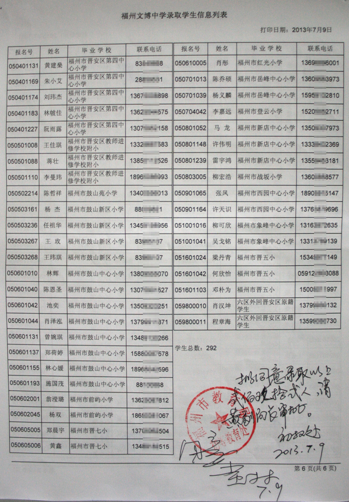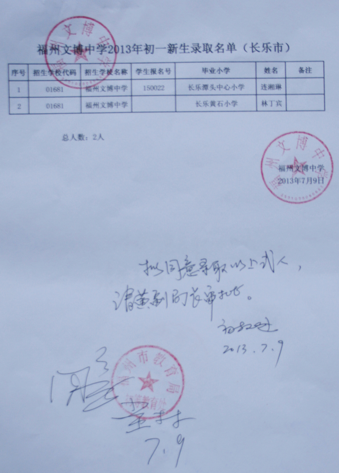 经福州市教育局批准,我校2013级秋季初一新生名单如下(发榜在学校大门口)。