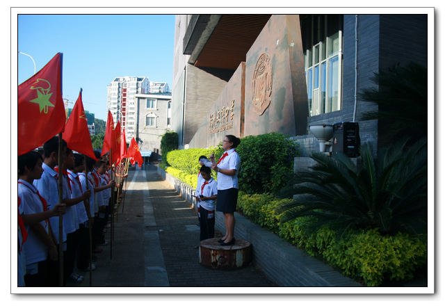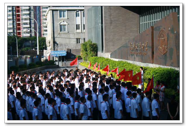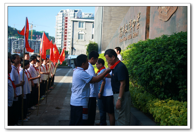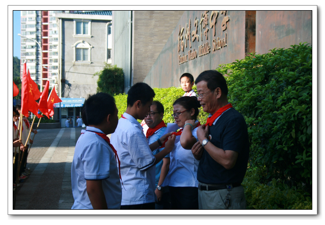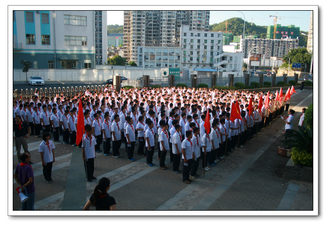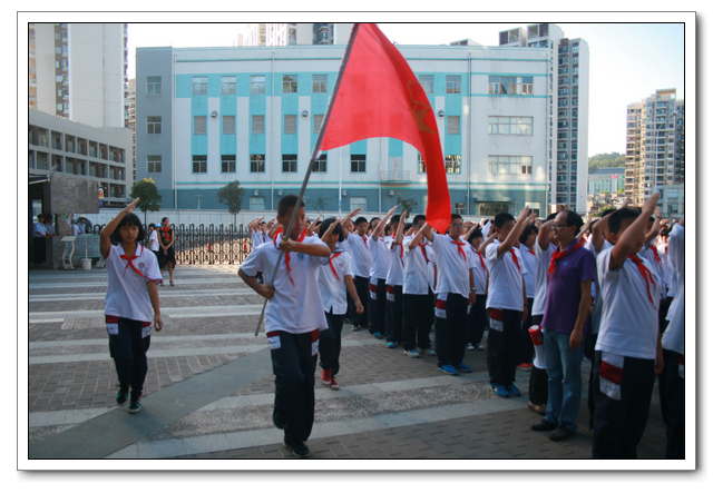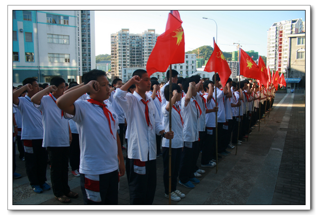 活动秩序井然,举行了隆重的出旗仪式,集会由初一(4)班肖汉坤主持,全体少先队员们齐声高唱《中国少年先锋队队歌》“我们是共产主义接班人……”熟悉的旋律,嘹亮的歌声,振奋了在场的每一位学生,感染了每一位老师。敬爱的朱校长发表了热情洋溢的讲话,勉励全体少先队员进一步增强责任感和荣誉感,努力学习,时刻准备着迎接新的挑战。初一(9)班彭家意代表少先队员发表了讲话。在大队辅导员陈锦霞老师的带领下,全体少先队员在队旗下庄严呼号:“时刻准备着!”