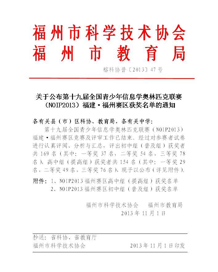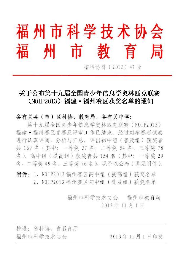 热烈祝贺我校初中信息学奥赛班学员在第十九届全国青少年信息学奥林匹克联赛(简称NOIP2013)中再次取得优异的成绩。在10月13日的初赛(市赛)中,我校初二年级共有四位同学获得市级奖项,其中初二2班的罗立阳同学以98.5分的好成绩夺得一等奖,顺利晋级复赛(省赛),这也是我校自建校以来派遣选手参加信息学奥赛所获得的最好成绩!同时入围复赛的还有初二6班的郝子书同学,希望他们再接再厉,在复赛中继续为我校增光添彩、取得更好的成绩!