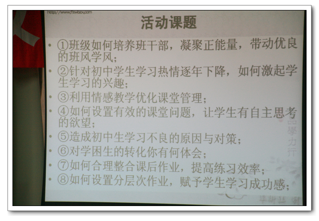 1、班级如何培养班干部,凝聚正能量,带动优良的班风学风;2、针对初中学生学习热情逐年下降,如何激起学生学习的兴趣;3、利用情感教学优化课堂管理; 4、如何设置有效的课堂问题,让学生有自主思考的欲望; 5、造成初中生学习不良的原因与对策;6、对学困生的转化你有何体会;7、如何合理整合课后作业,提高练习效率;8、如何设置分层次作业,赋予学生学习成功感。