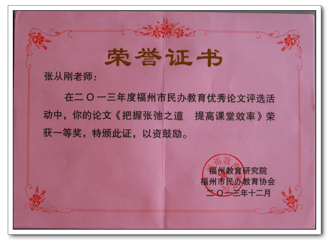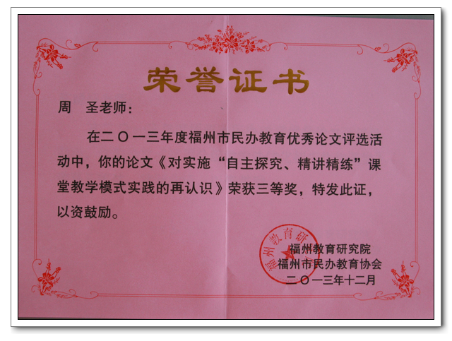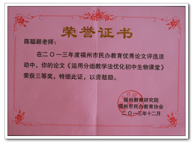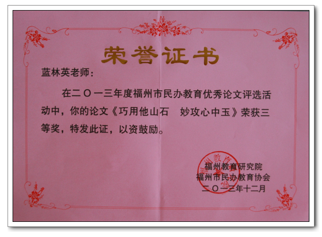 2013年12月,福州市教育研究院与福州市民办教育协会联合举办“2013年度福州市民办学校教师优秀论文征集评选”活动,共收到13所民办校提交的166篇论文,评委从中筛选了121篇进行汇篇,共有20篇荣获一、二、三等奖。我校提交送审的13篇论文,全部入编优秀论文集,并有四篇论文获奖。