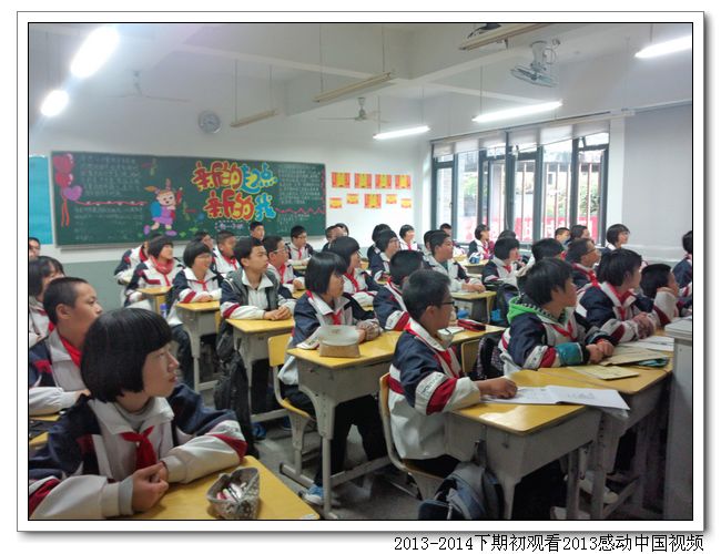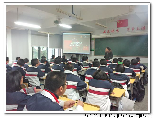 期初,德育处组织全校学生,在班会课上观看《2013感动中国十大人物》视频。