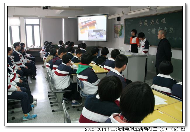 3月10日下午,我校组织开展了主题班会观摩活动,本次活动的主题是“培养良好习惯” ;承办班级为初二(5)班、初二(8)班、高一(3)班、高一(4)班(班主任马耀新、黄鑫、邱琼、林海莺老师)。全体年段长、班主任参加观摩。学校领导俞继圣校长、朱之琳副校长、周啸翔副校长等参加了观摩。