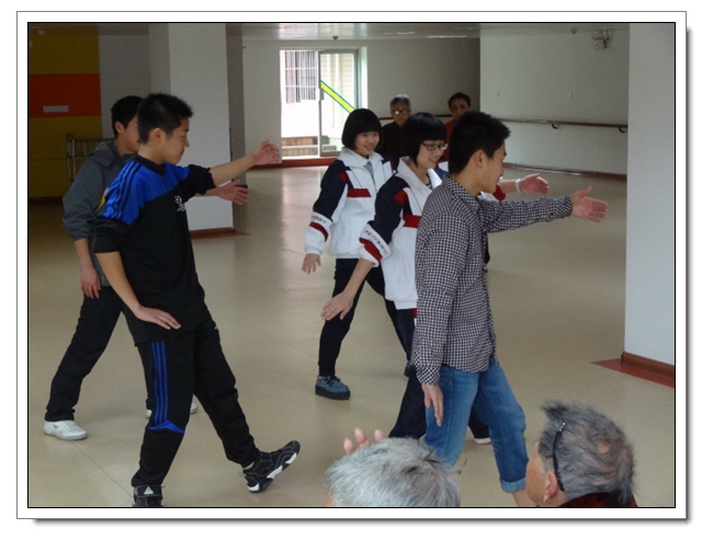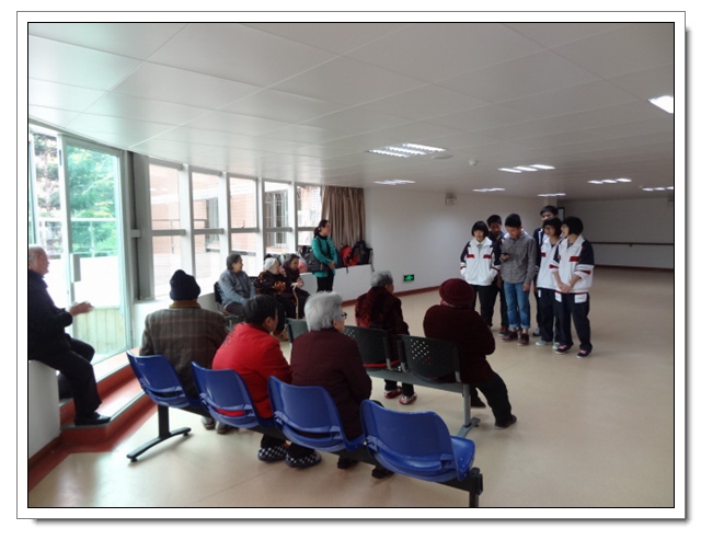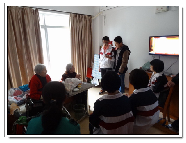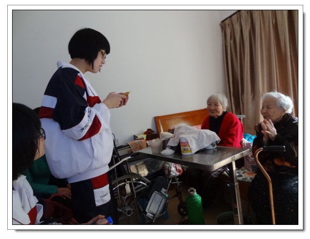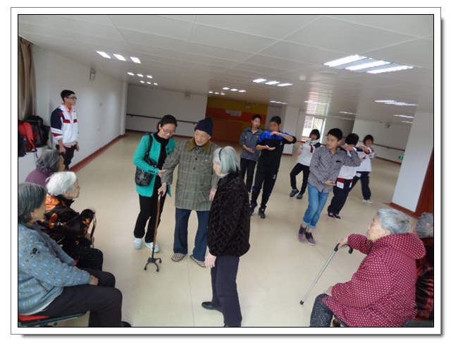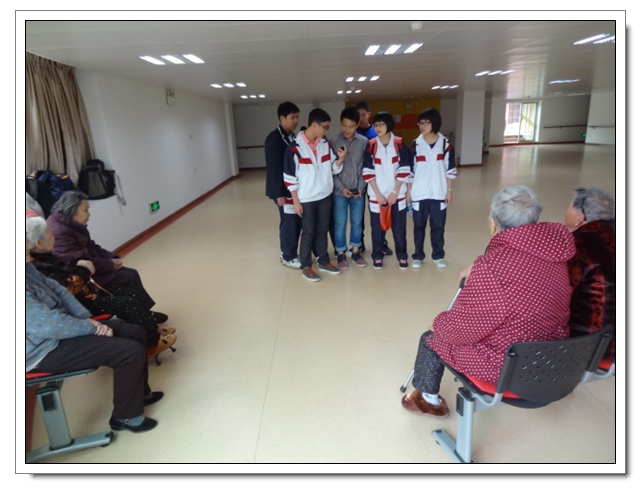 志愿者们还没有进门,就有年近90高龄的奶奶笑容满面地来迎接,让同学们惊讶的是奶奶们主动先给同学们唱起了红歌,接着志愿者们为老人们表演了节目:太极拳、歌曲演唱……老人们像孩子似的露出了甜甜的笑。不知不觉两个小时过去了,老人们依依不舍地用沙哑的声音唱着《祝你平安》送大家离开!通过这次活动,不仅提高了同学们敬老、爱老、助老的意识,同时陶冶了学生的情操,增强了同学们的社会责任感。同时也让同学们深深地感受到:老人们是多么需要儿女及他人的关怀,我们每个人都应该好好的关爱身边的每位老人!