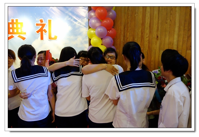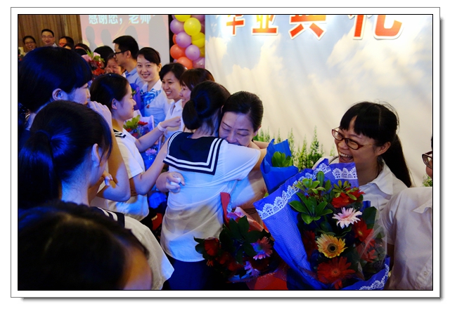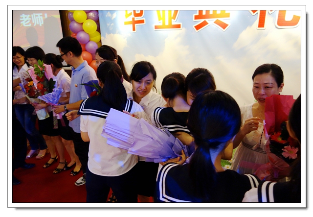 学生向老师们献花,师生深情相拥。