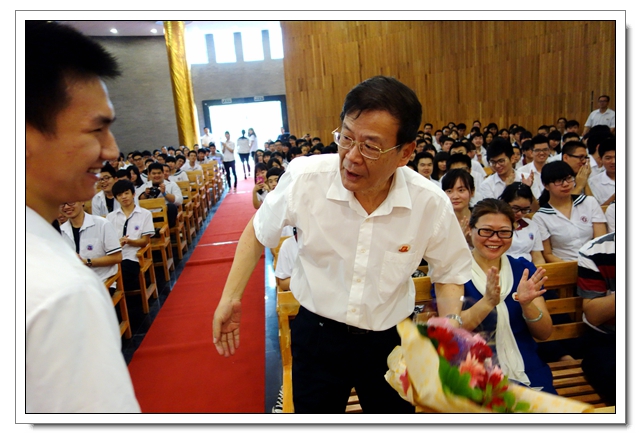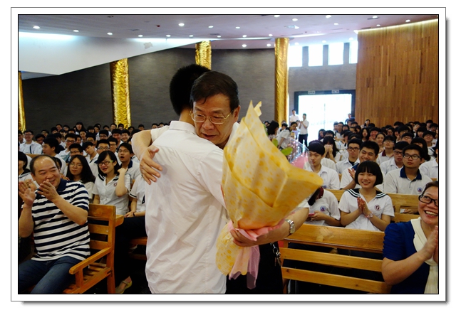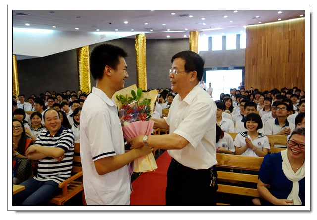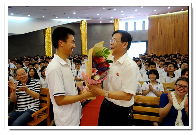 理科班“长冠王”魏名翔向校长献花,他的姐姐也是文博2012届高三毕业生