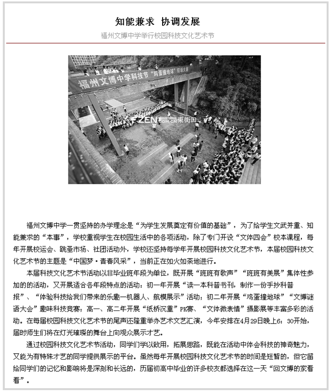 晚报链接:知能兼求 协调发展──福州文博中学举行校园科技文化艺术节