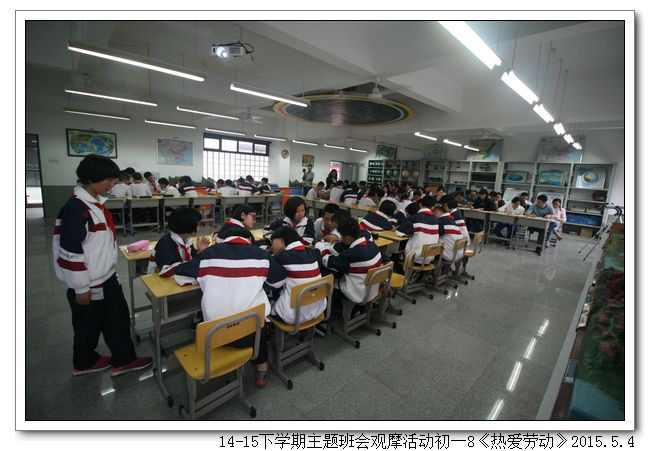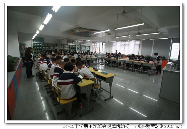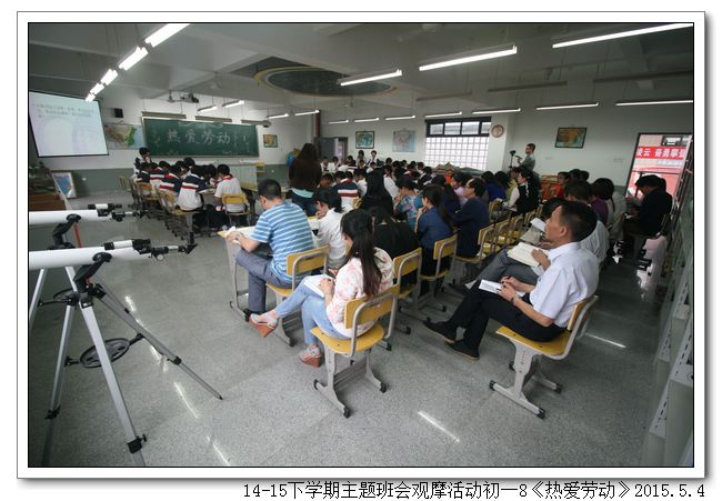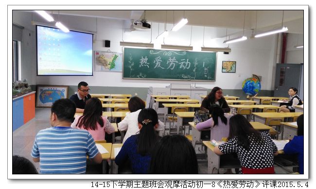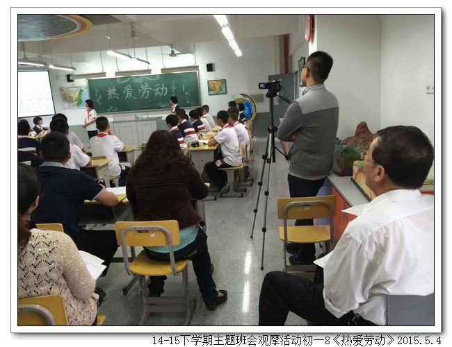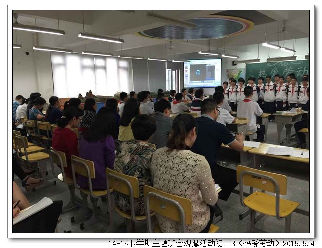 五月是劳动者的节日,劳动创造了世界,创造了文明,也创造了如今幸福的生活。劳动是艰辛的,劳动是光荣的,劳动是令人骄傲的一件事。2015年5月4日下午,初一8班(班主任:王少娟)以“热爱劳动”为题开展了一场主题鲜明、形式新颖的主题班会。合唱歌曲《劳动最光荣》拉开了序幕,同学们精神气足,嘹亮的歌声给在场的老师们留下了深刻的印象。接着是小品欣赏、讲故事、三句半、名人名言、分组讨论等环节,紧紧围绕主题,一步步把班会推向高潮。