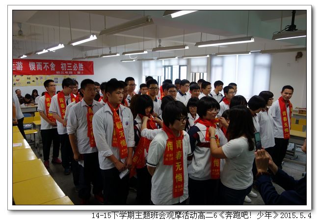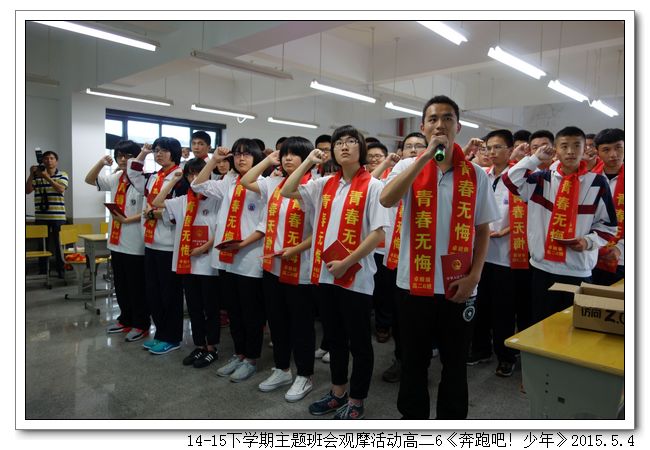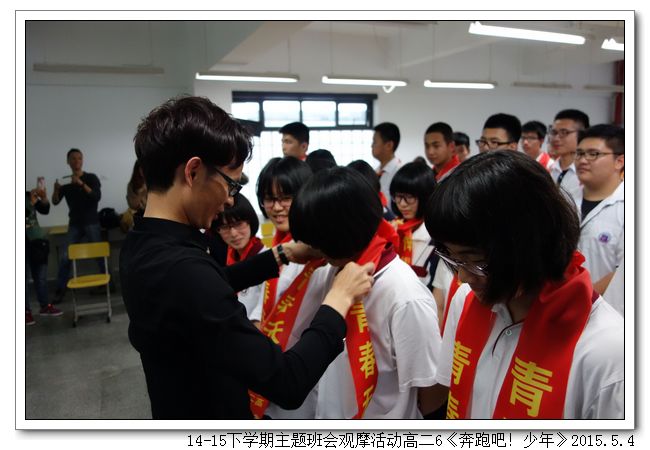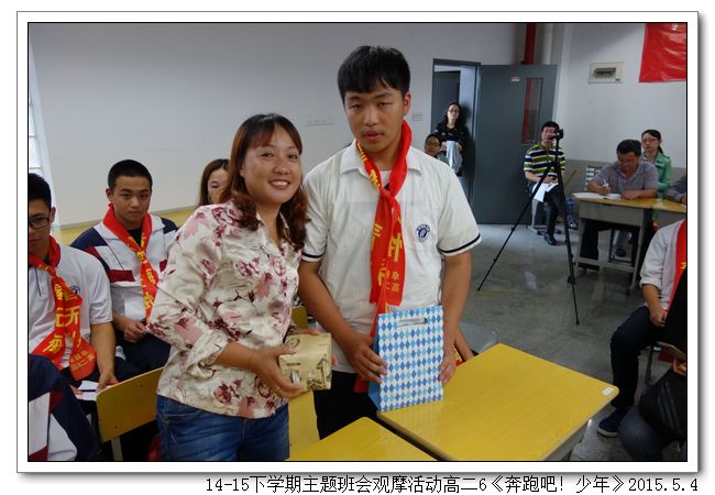 五四——是青年人的节日;十八岁——是人生新的起点。十八岁不仅是一个生命成熟的标志,更意味着学生要对自己的言行负责,要独自面对和解决难题,要对家庭和社会负责。5月4日下午,高二6班(班主任:刘燕)以“奔跑吧!十八岁!”为题开展了一场主题班会。班会由三个篇章组成,第一篇章“成长的足迹”,通过欣赏情景剧和同学们的儿时照片,感受成长的足迹,诠释成长的困惑。第二篇章“青春的思考”,举办了庄严的成人仪式,家长和老师们给同学们系上成年礼巾、赠送宪法、组织宣誓、亲子互赠礼物;让同学们感受到浓浓的亲情、也懂得了沉甸甸的责任。第三篇章“未来的憧憬”,组织观看视频“一场特殊的马拉松赛”、表达成长心语、老师寄语。班会在重温互赠礼物的亲情中落下了帷幕。