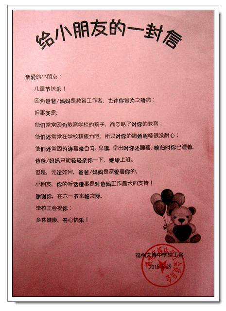 福州文博中学现有两百多位教职员工,虽然学校办学只有9年,但学校发展迅猛,现有52个班级,2400多位学生。自办学以来,学校吸引了众多优秀教师加盟,教师们多以校为家,认真抓好学生的教育教学,办学成绩突出。学校年轻教师约占百分之七十,相当部分教工子女都是未成年,在“六•一”儿童节来临之际,校工会为教工子女送上一份真诚的祝福!希望我们的下一代能健康、快乐地成长。
