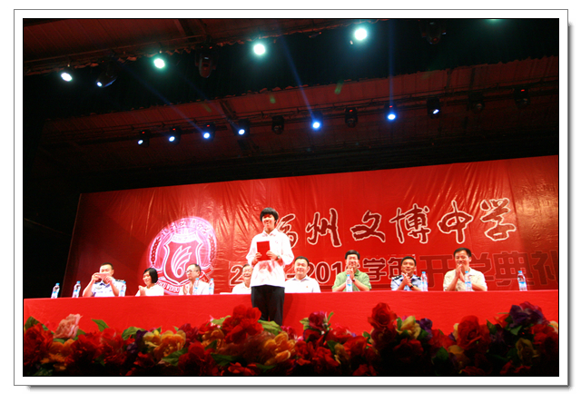俞继圣校长首先在典礼上致辞。首先,校长对加盟文博大家庭的新老师、新同学表示了热烈欢迎。其次,校长总结了上学年我校办学成果,代表学校向市教育局、学校董事会、全体师生和校友、全体学生家长和社会各届的支持表达了最诚挚的谢意!接着,校长阐述了我校“为学生发展奠定有价值的基础” 的办学理念,希望全体学子在文博中学这块沃土茁壮成长,实践习近平总书记对青少年学生的嘱咐:珍惜学习机会,为人生积累能量。同时对全体同学提出了三点希望:一要定向,要有理想;二要行动,脚踏实地、自强不息;三要坚持,要有毅力。希望同学们作一个知书达理、努力进取、健康阳光、充满自信的人,要相信,你若精彩,天自安排。最后,校长号召全体师生行动起来,在新一轮的十年发展规划的引领下,向一级达标的目标迈进,全力以赴把我校建设成有显著教育质量、有良好社会声誉、受人尊敬的优质学校,共同去创造文博新辉煌!