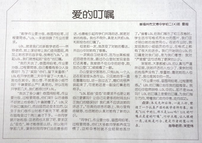 点评:本文先抑后扬,一波三折,塑造了一个认真严谨的数学老师形象。结尾“L0L中的L,那不是love吗?L0L的叮嘱正是爱的叮嘱”,巧妙点题,让人眼睛一亮,这既是巧合,更是作者的慧心所在。 指导老师:宋宏伟